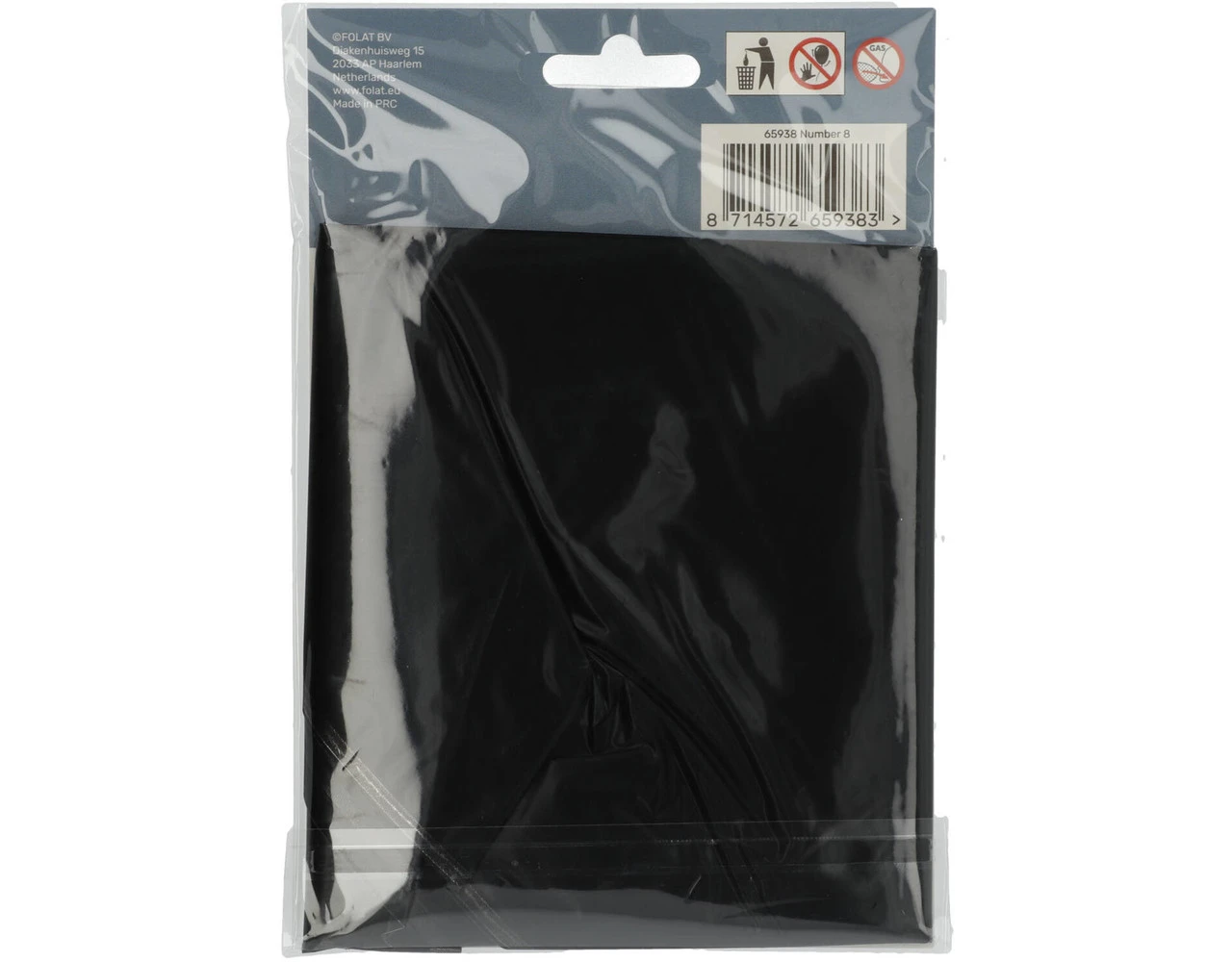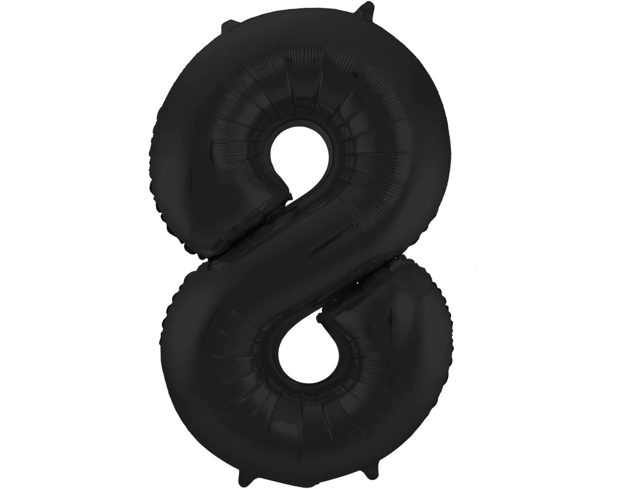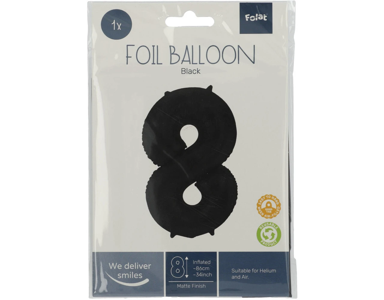 Folieballon Cijfer 8 Zwart Metallic Mat – 86 cm. Inhoud: 1 folieballon. Kleur: Zwart. Bijvoorbeeld te gebruiken tijdens de volgende feestgelegenheid/feestgelegenheden: Verjaardag, Kinderfeestje en Jubileum. Deze folieballon is 34 inch/86 cm. Het artikel is gemaakt van folie.