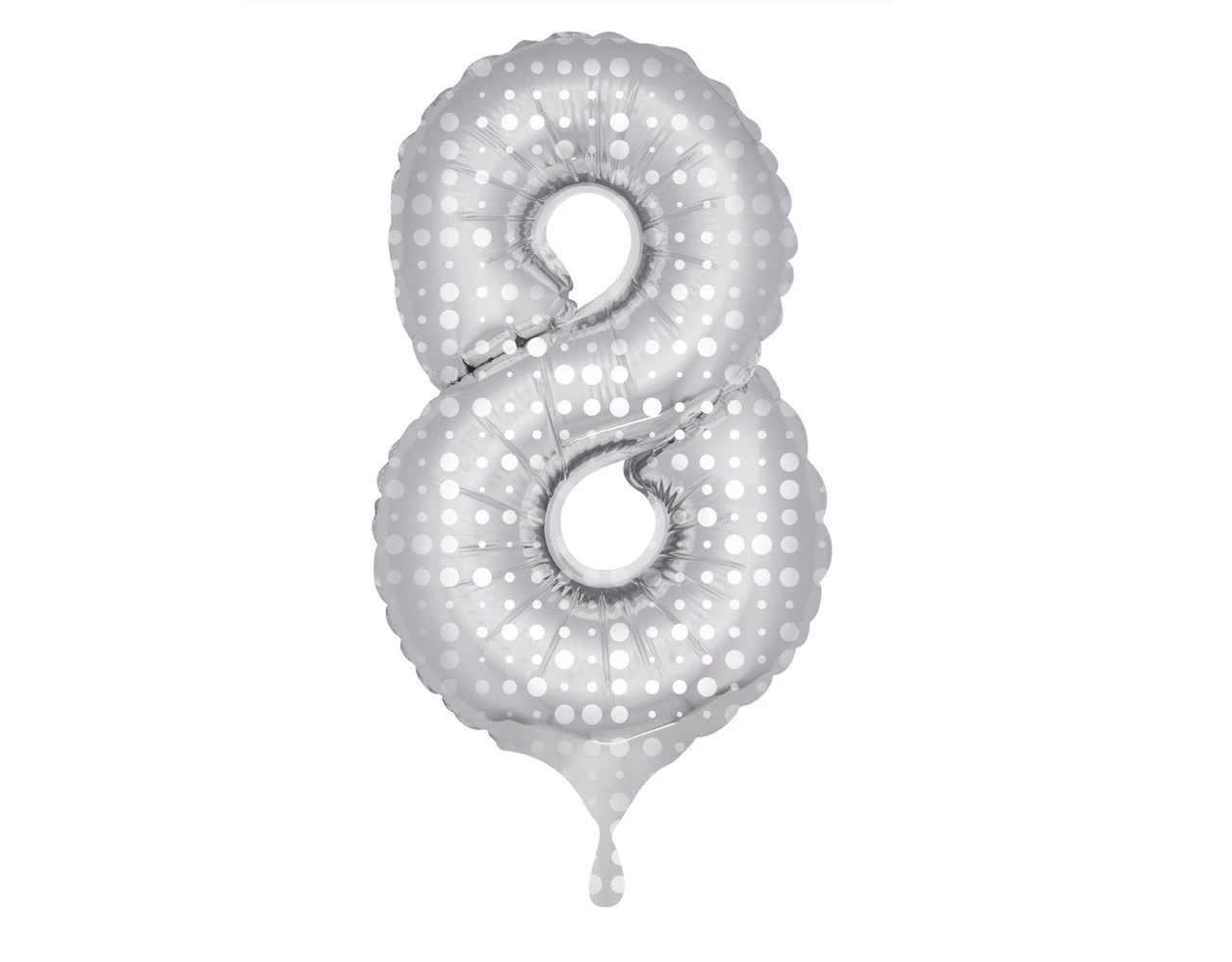 Cijfer Ballon Nummer 8 met Stippen – 86cm. Inhoud: 1 folieballon. Kleur: Zilverkleurig. Bijvoorbeeld te gebruiken tijdens de volgende feestgelegenheid/feestgelegenheden: Verjaardag, Jubileum en Kinderfeestje. Deze folieballon is 34 inch/86 cm. Het artikel is gemaakt van folie.