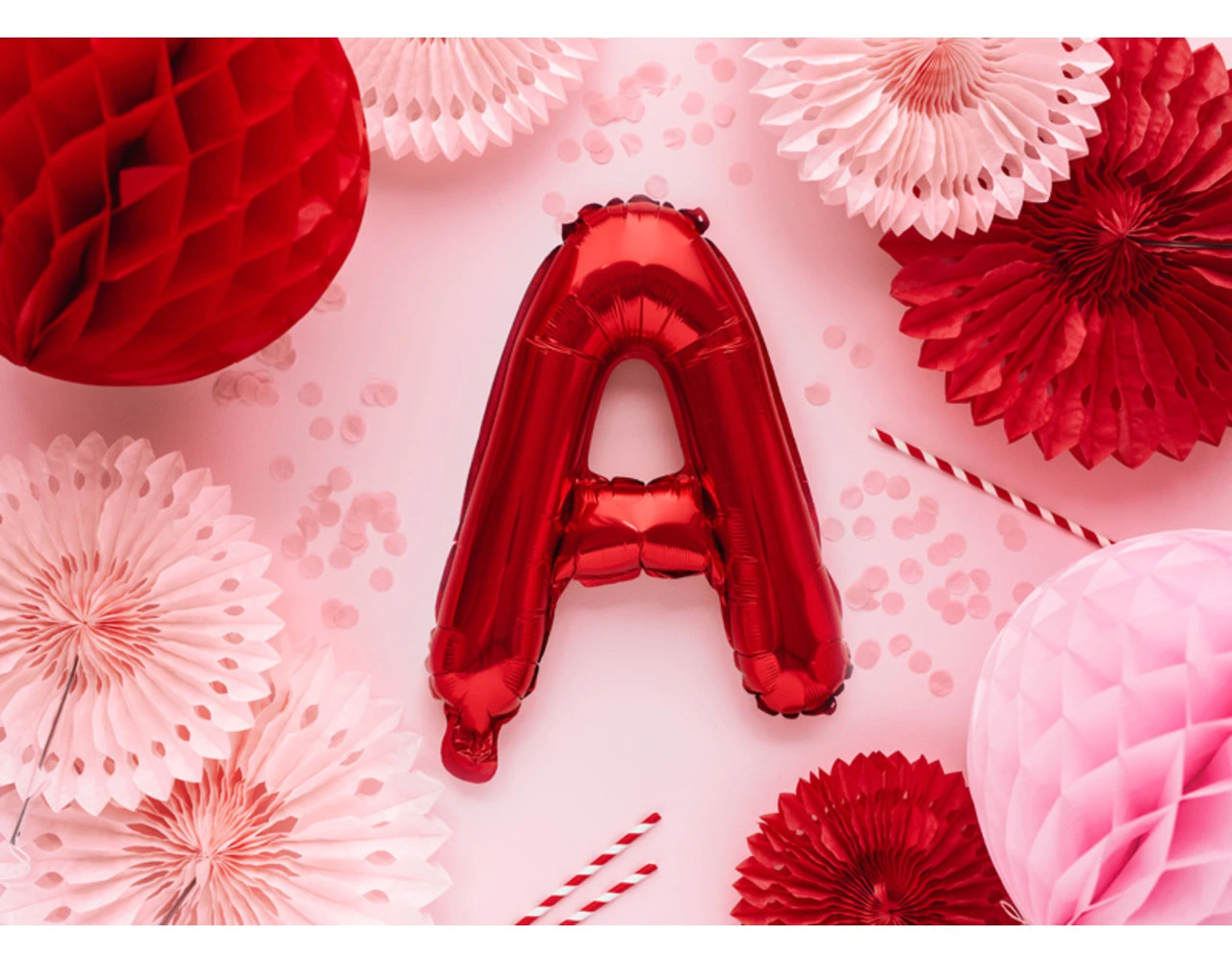 Metallic folie ballon Letter ”A”, rood, grootte voor opblazen ca. 40 cm (16”), hoogte ca. 35 cm (14”). Opblazen met lucht.