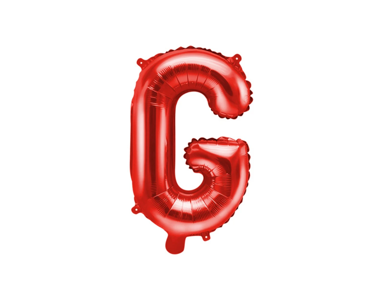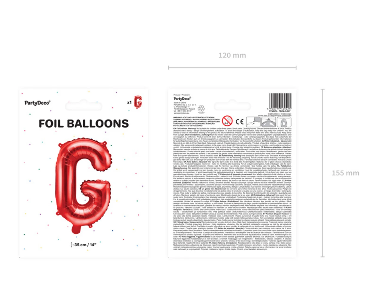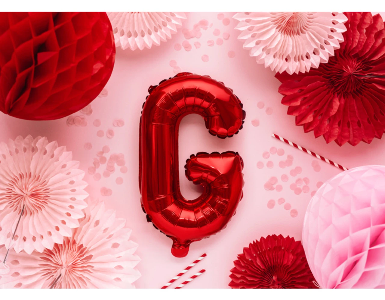 Metallic folie ballon Letter ”G”, rood, grootte voor opblazen ca. 40 cm (16”), hoogte ca. 35 cm (14”). Opblazen met lucht.