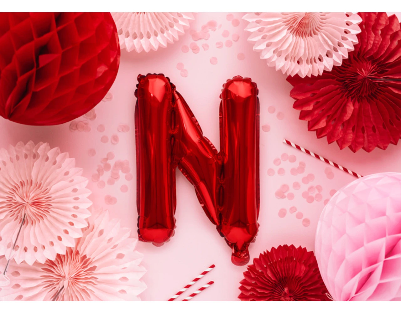 Metallic folie ballon Letter ”N”, rood, grootte voor opblazen ca. 40 cm (16”), hoogte ca. 35 cm (14”). Opblazen met lucht.