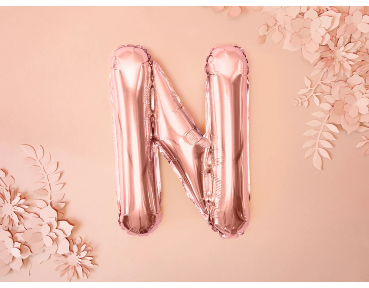Metallic folie ballon Letter ”N”, rose goud, grootte voor opblazen ca. 40 cm (16”), hoogte ca. 35 cm (14”). Opblazen met lucht.