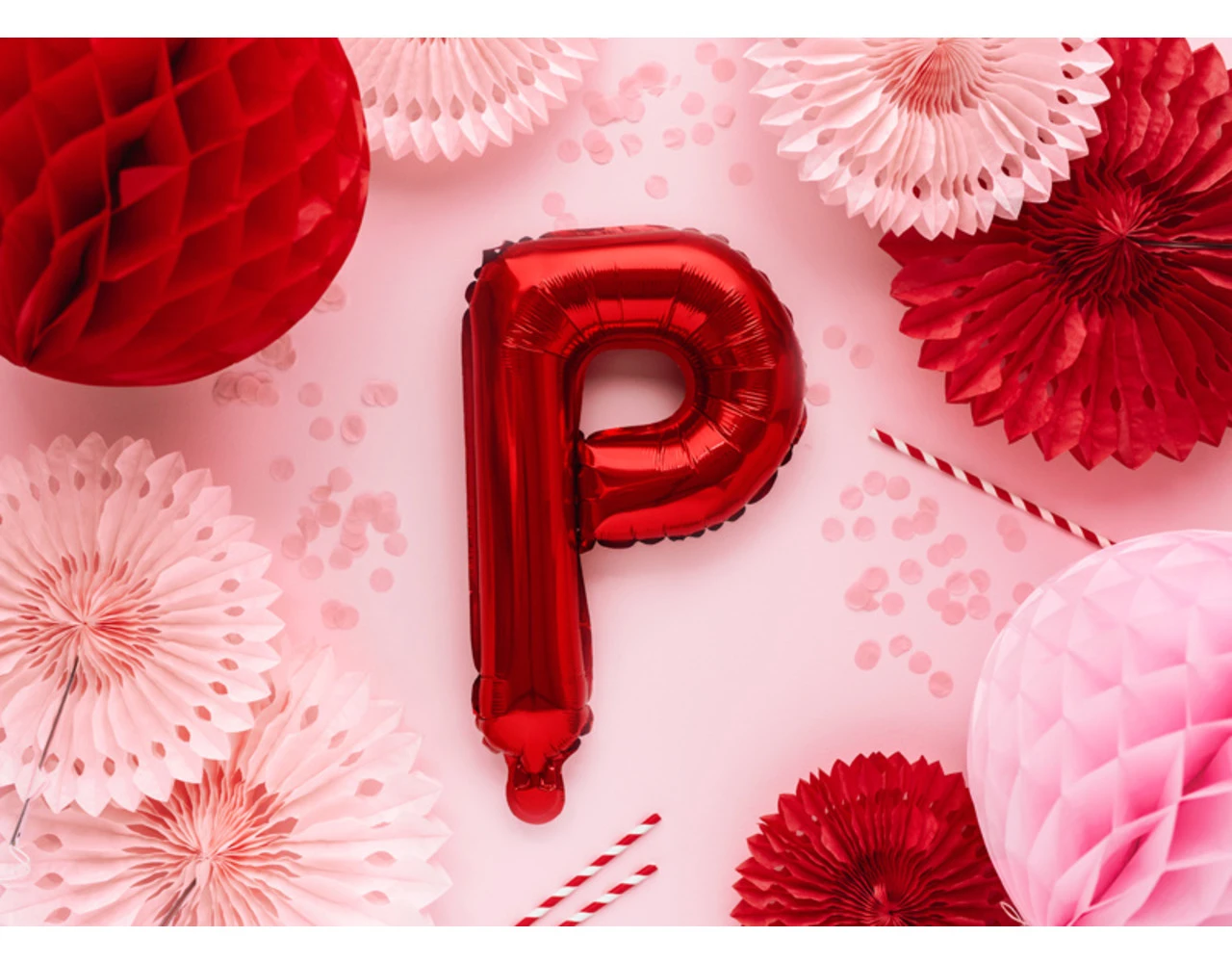 Metallic folie ballon Letter ”P”, rood, grootte voor opblazen ca. 40 cm (16”), hoogte ca. 35 cm (14”). Opblazen met lucht.