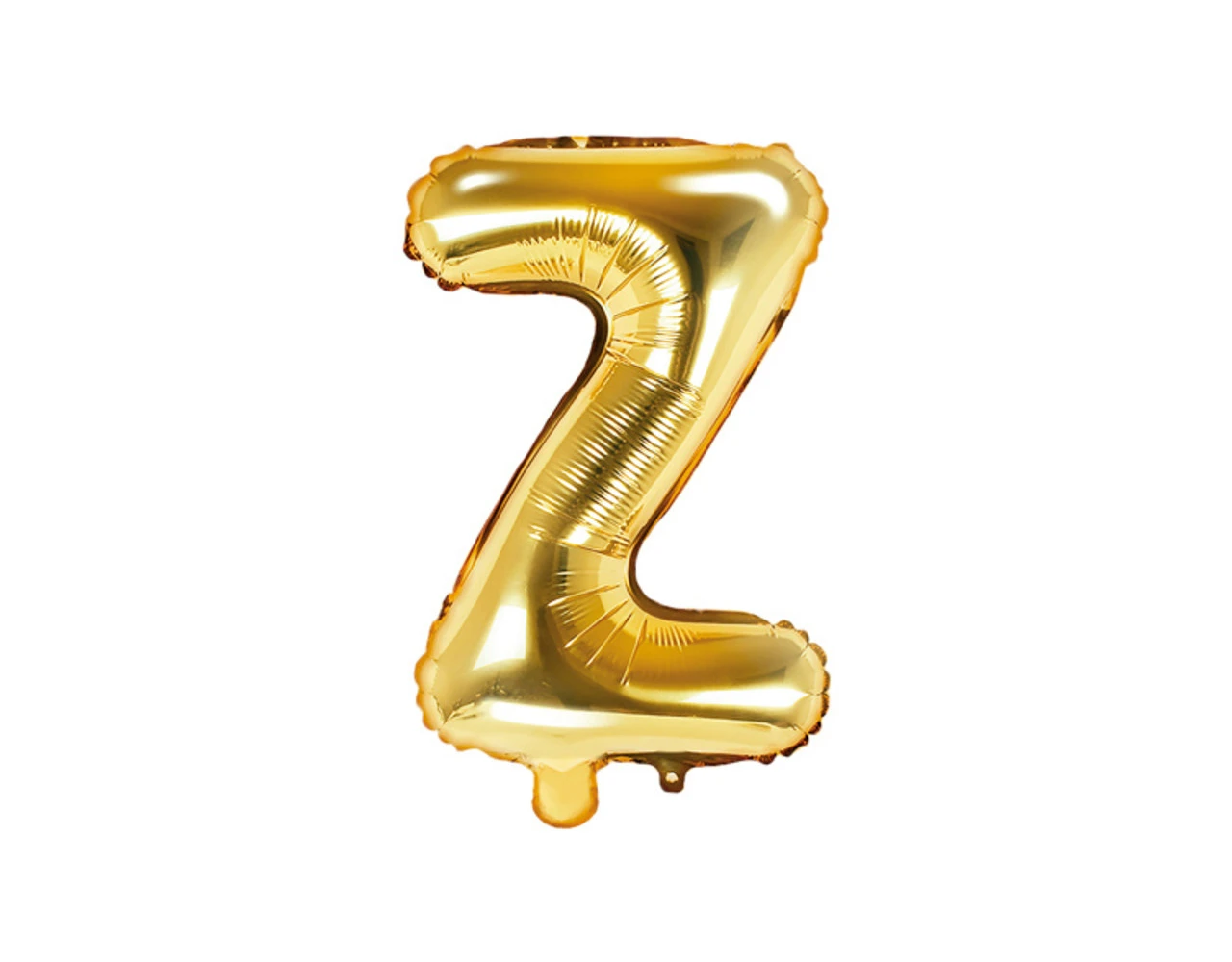 Metallic folie ballon Letter ”Z”, goud, grootte voor opblazen ca. 40 cm (16”), hoogte ca. 35 cm (14”). Opblazen met lucht.