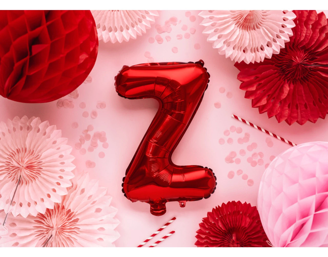 Metallic folie ballon Letter ”Z”, rood, grootte voor opblazen ca. 40 cm (16”), hoogte ca. 35 cm (14”). Opblazen met lucht.