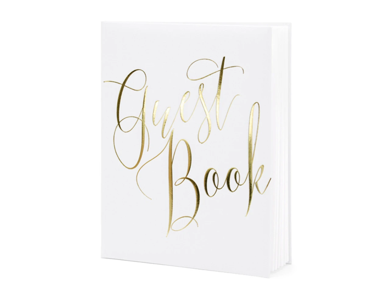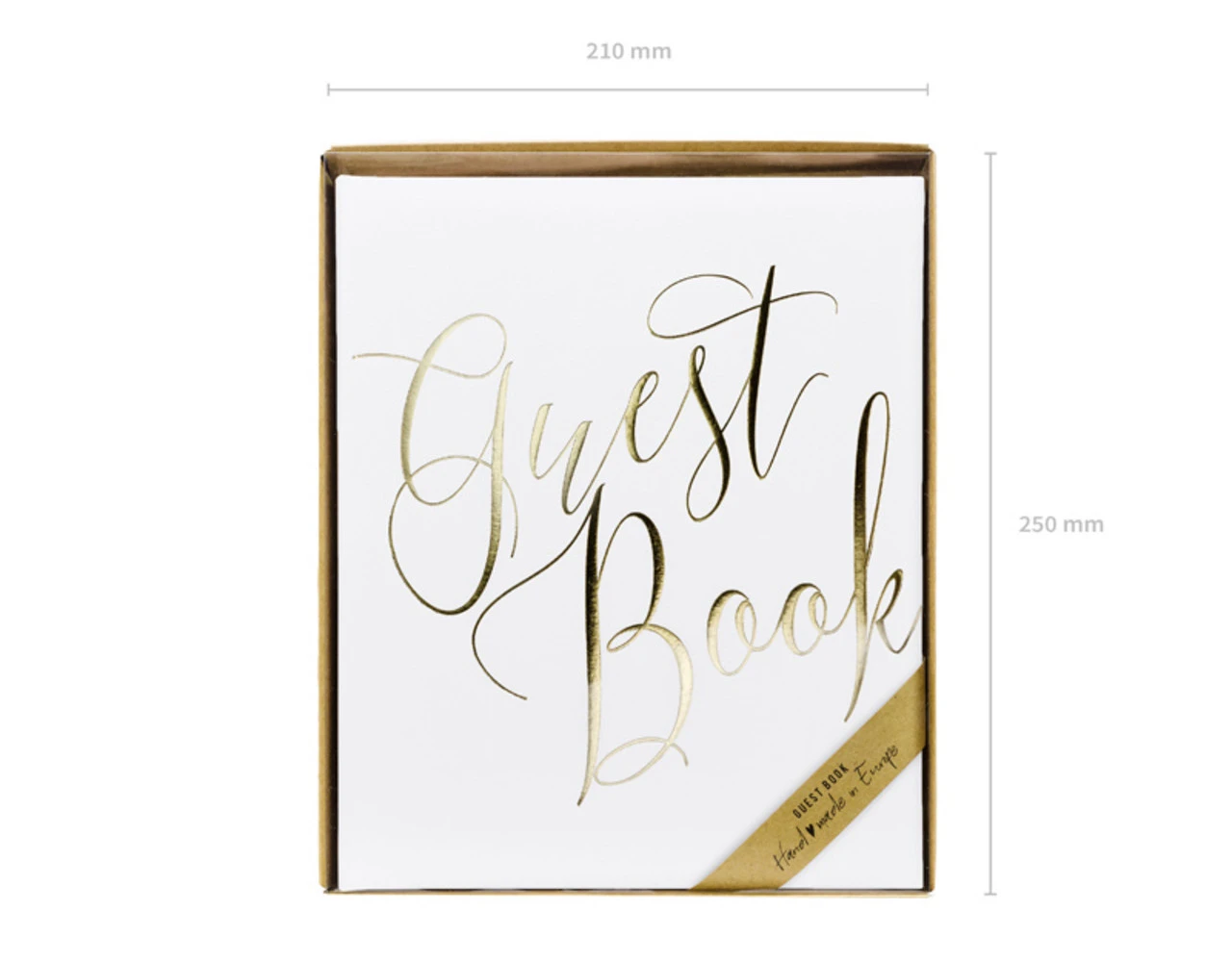 Gastenboek gebonden in wit papier met een gouden inscriptie, formaat ca. 20 x 24,5 cm 22 pagina’s, zonder tekst.