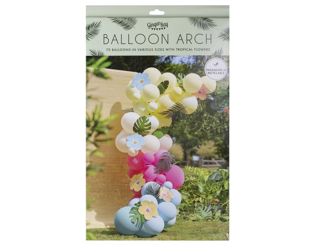 Aantal: 70 ballonnen ( blauw, roze, perzik, groen , geel), 6 bloemen ( perzik, geel, blauw ), 4 palmbladeren, 4 kaasplantbladeren, 3 bananen bladeren, ballontape , touw.