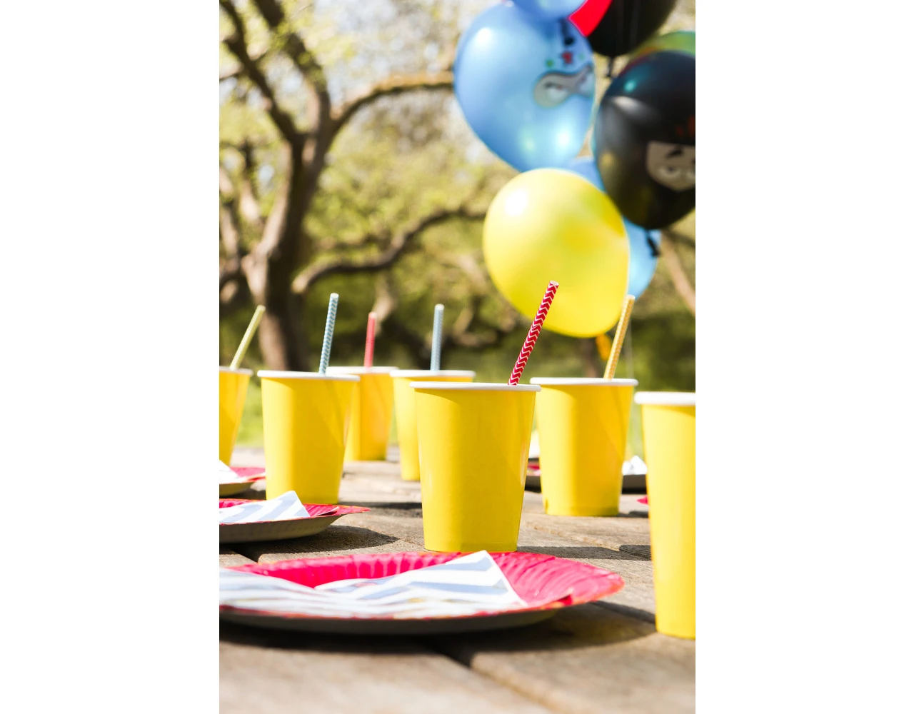Gele Bekers 350ml – 8 stuks. Inhoud: 8 bekers. Kleur: Geel. Bijvoorbeeld te gebruiken tijdens de volgende feestgelegenheid/feestgelegenheden: Verjaardag, Kinderfeestje, Themafeest. Een beker heeft een inhoud van 350 ml. Het artikel is gemaakt van papier.