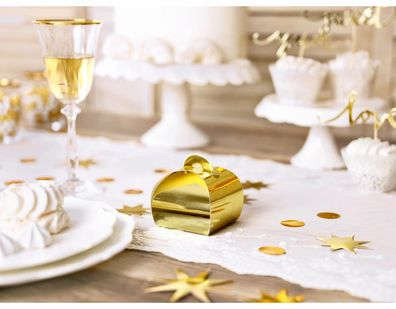 Inhoud: Dozen gemaakt van spiegel goud papier, maten ong. 6 x 6 x 5.5 cm. (1 PKT / 10 st.)