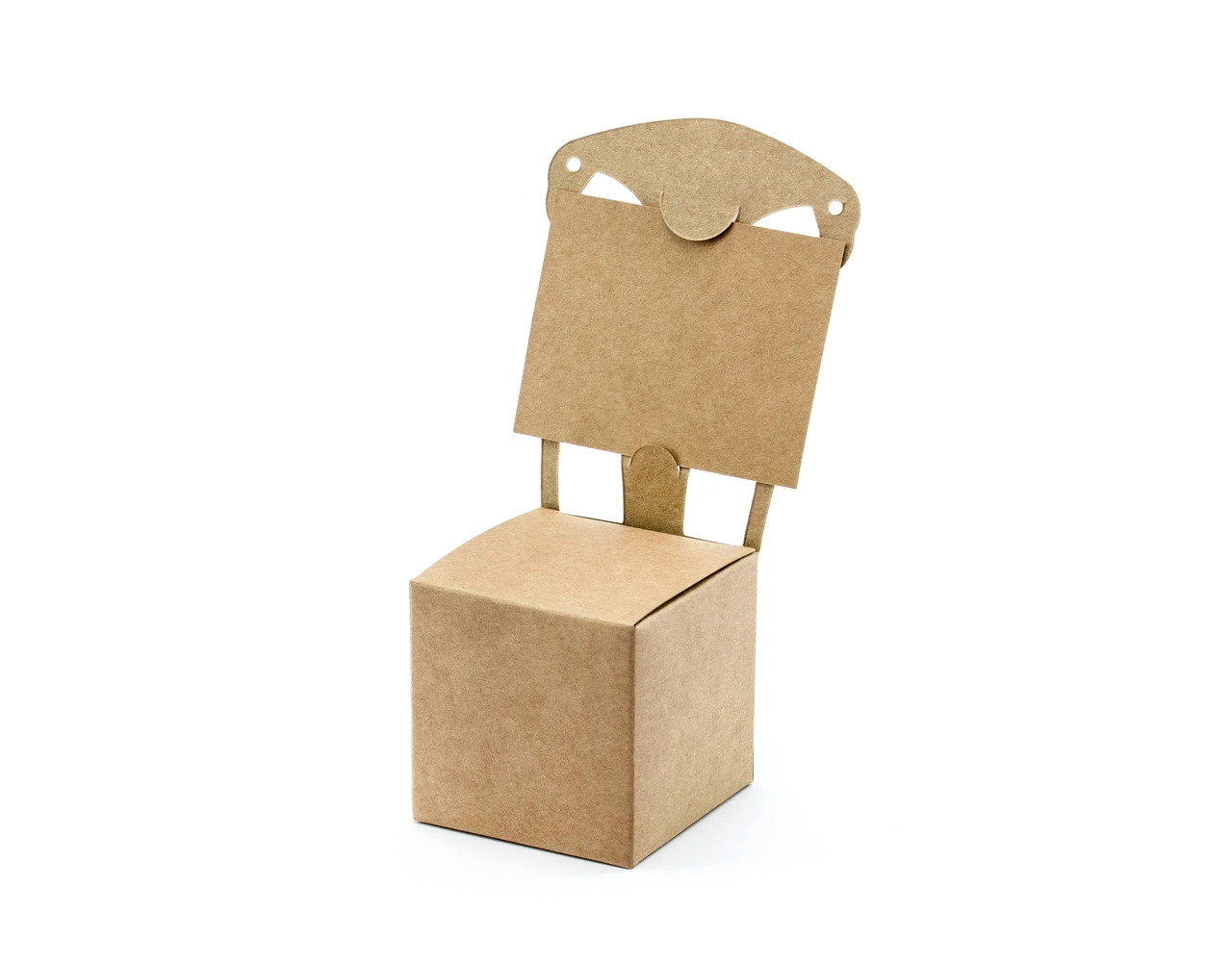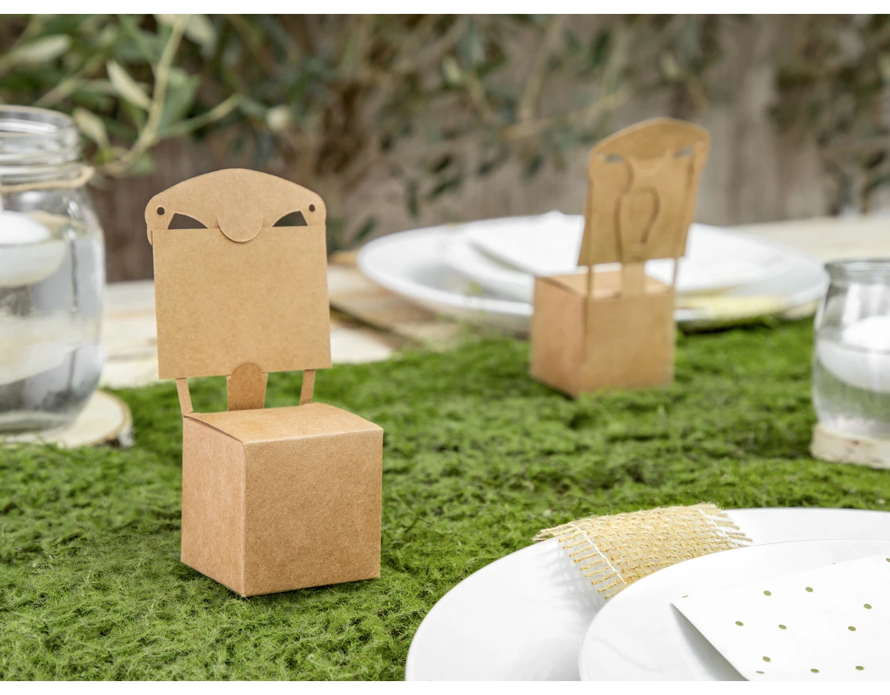 Inhoud: Dozen stoel gemaakt van kraftpapier met een plaats kaart, grootte na het monteren van ca.. 5 x 5 x 5 cm (met rugleuning ong. 5 x 5 x 13,5 cm). (1 PKT / 10 st.)