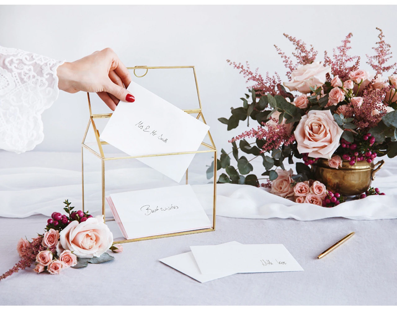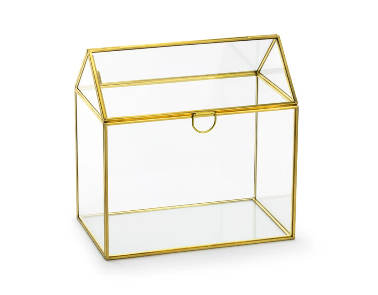 Glazen cadeaukaarthouder in de vorm van een huis met goudkleurige metalen randen, afmeting ca. 13x21x21 cm.
