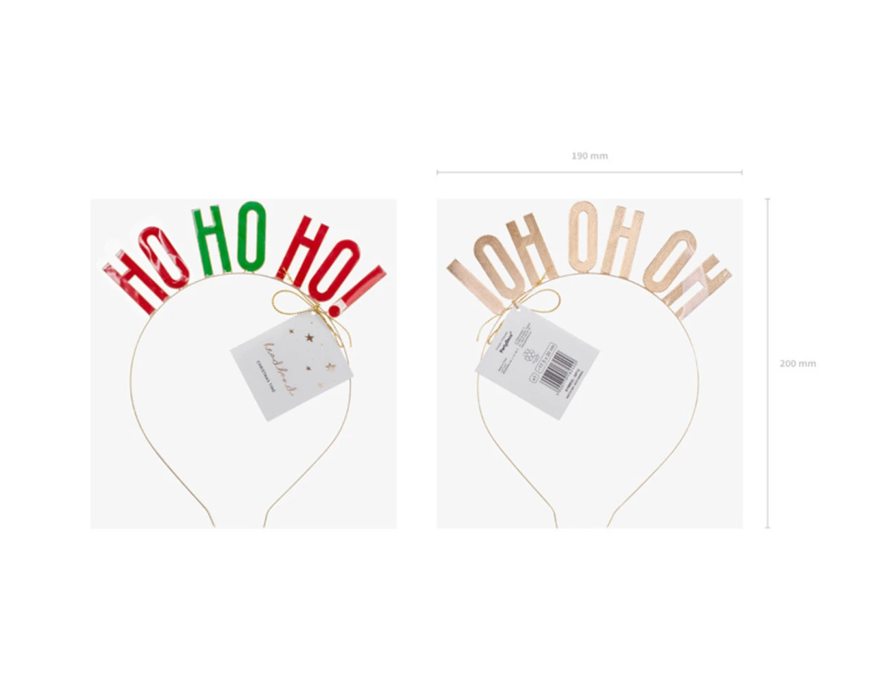 Metalen hoofdband HO HO HO! in goudkleur met kleurrijke opdruk, afmeting ca. 17,5 x 20 cm.