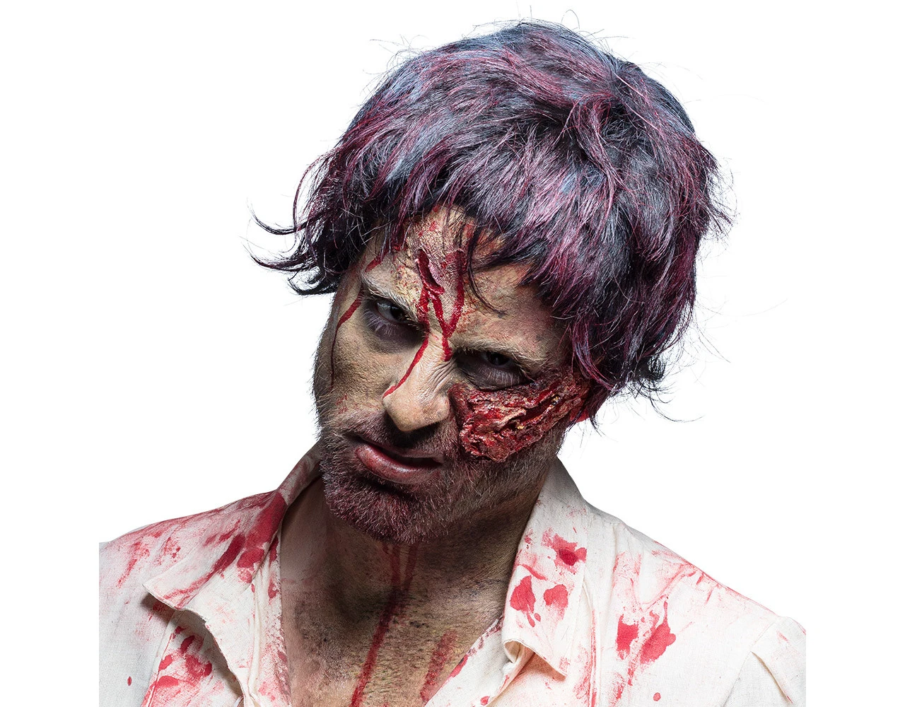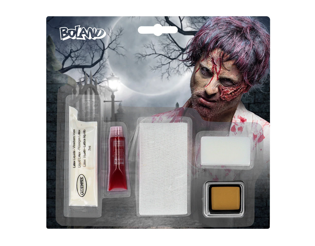 Onderdelen: vloeibare latex, nepbloed, spons, wit gaas, schmink