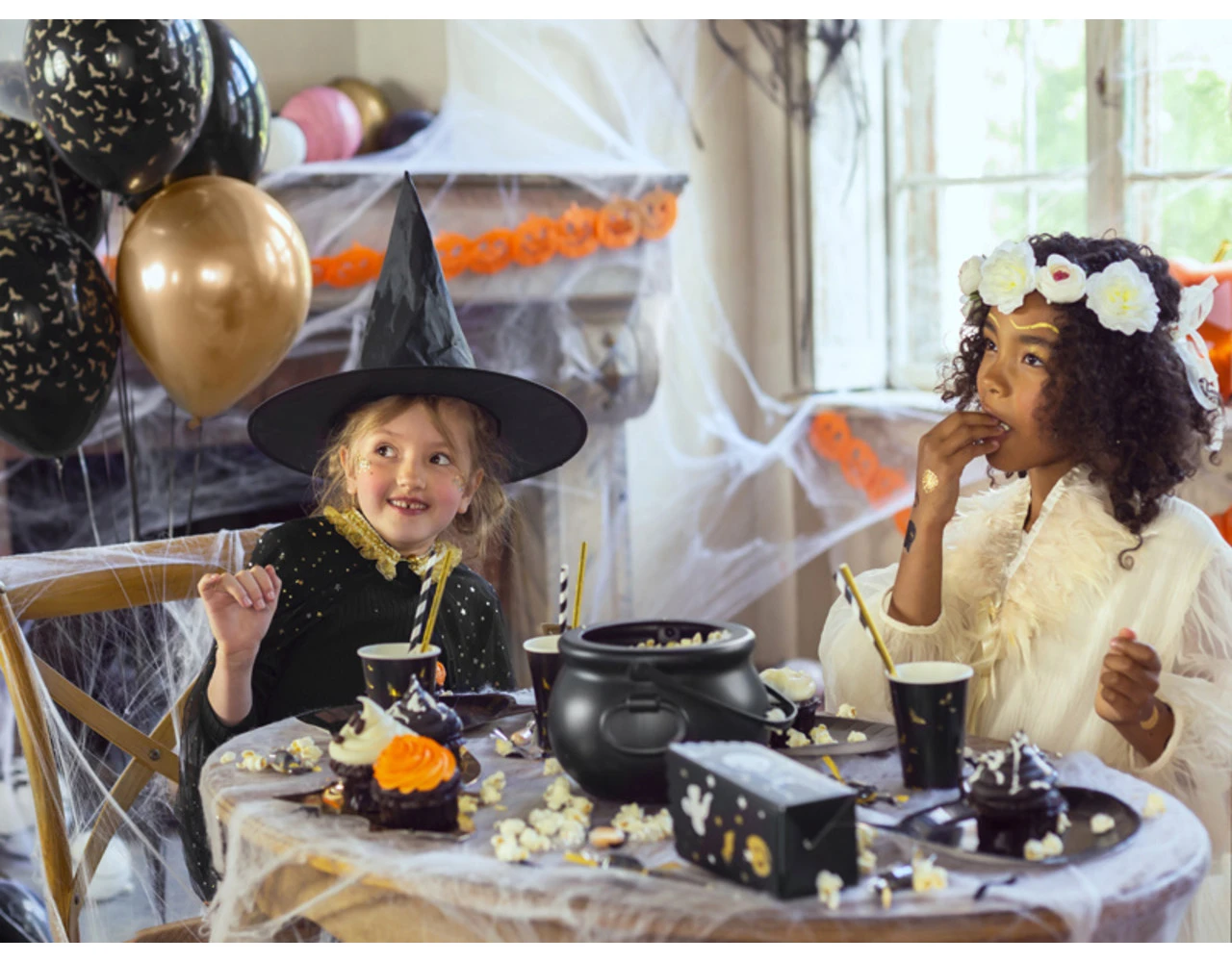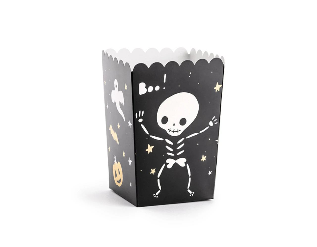 Dozen voor popcorn BOO! in zwarte kleur met witte en gouden metallic opdruk, afmeting na assemblage ca. 7 x 7 x 12,5 cm.