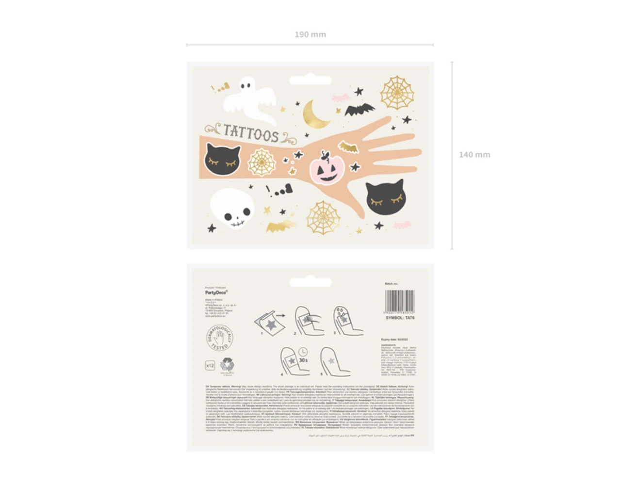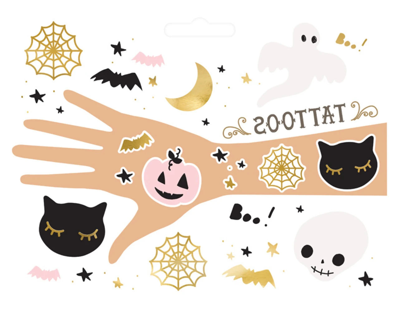 Tijdelijke tatoeages BOO!, mix van kleuren en motieven, set bevat 12 stuks tatoeages, ŽŽn tatoeage van elk motief.