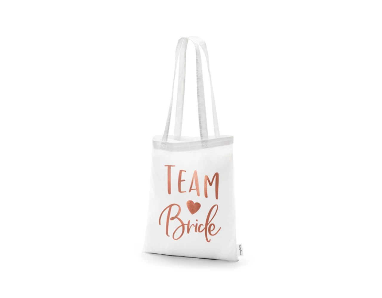 Draagtas van wit katoen met rosŽgoudkleurig opschrift Team bride, afmeting ca. 39 x 42 cm.