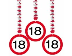 18 Jaar Verkeersbord Hangdecoratie – 3 stuks. Inhoud: 3 stuks hangdecoratie. Kleur: Meerkleurig. Productthema: Verkeersborden. Bijvoorbeeld te gebruiken tijdens de volgende feestgelegenheid/feestgelegenheden: verjaardag. De verkeersbord hangers zijn 17,5 x 17,5 cm. Het artikel is gemaakt van papier.