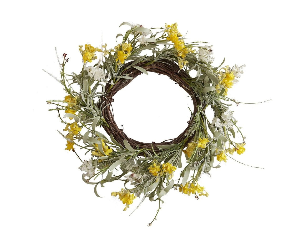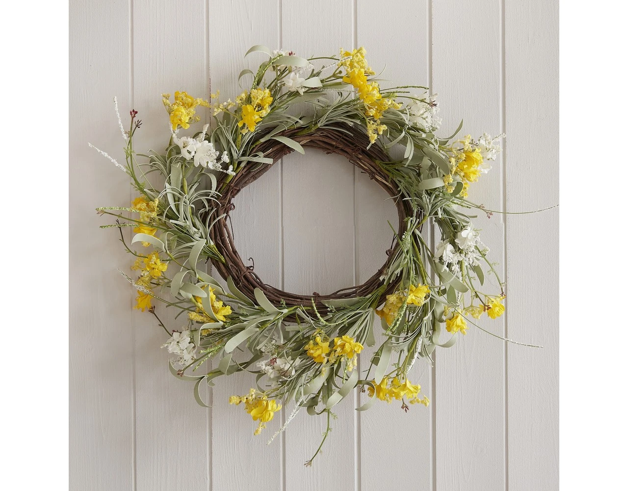 Verwelkom de lente in je huis met een ontluikende gele bladerkrans – de perfecte decoratie om je gasten te verwelkomen.