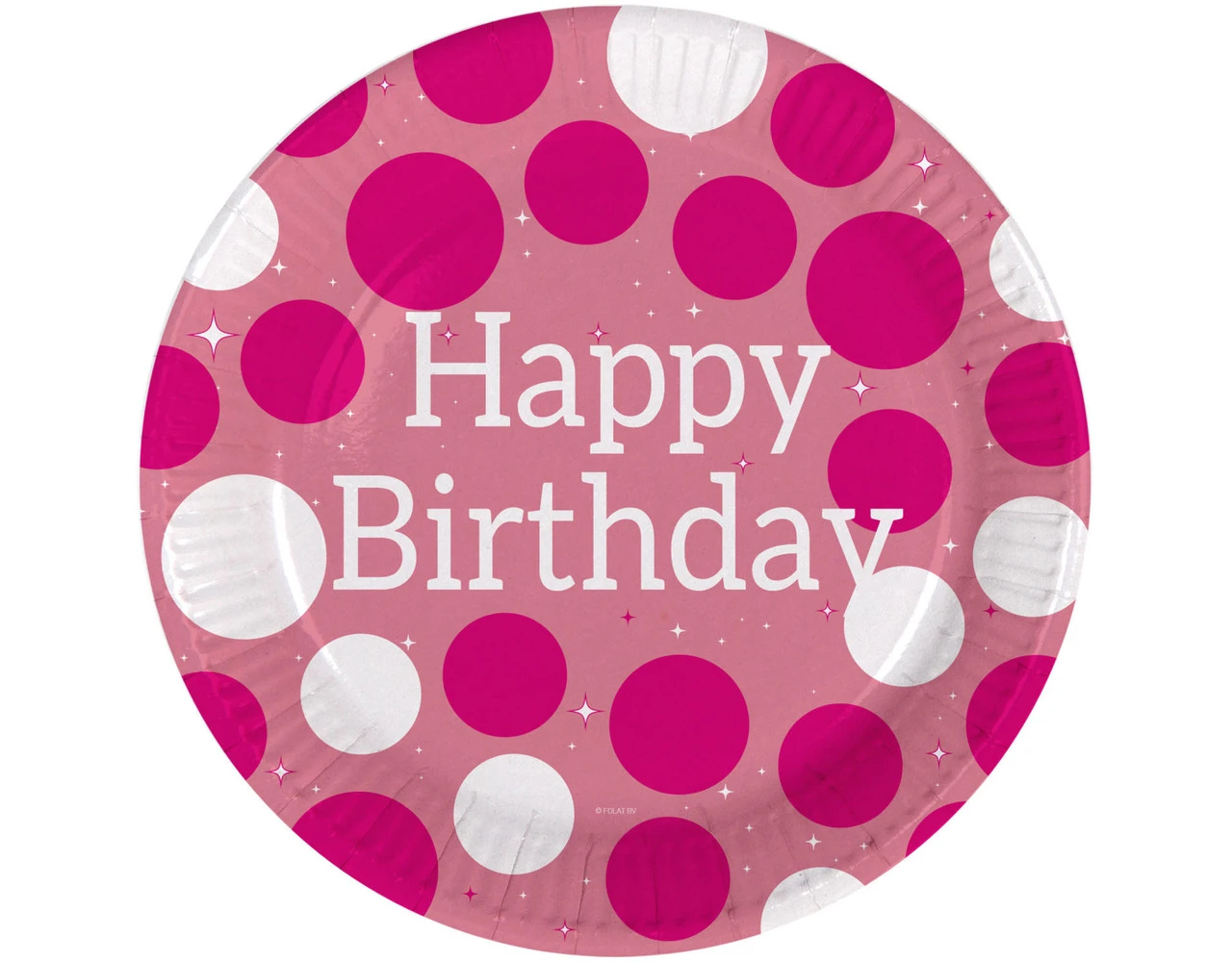 Borden Glossy Pink ‘Happy Birthday’ 23cm – 8 stuks. Inhoud: 8 borden van 23cm. Kleur: Roze. Bijvoorbeeld te gebruiken tijdens de volgende feestgelegenheid/feestgelegenheden: Verjaardag, Kinderfeestje en Tienerfeestje. Deze bordjes hebben een doorsnede van 23 cm. Het artikel is gemaakt van papier.