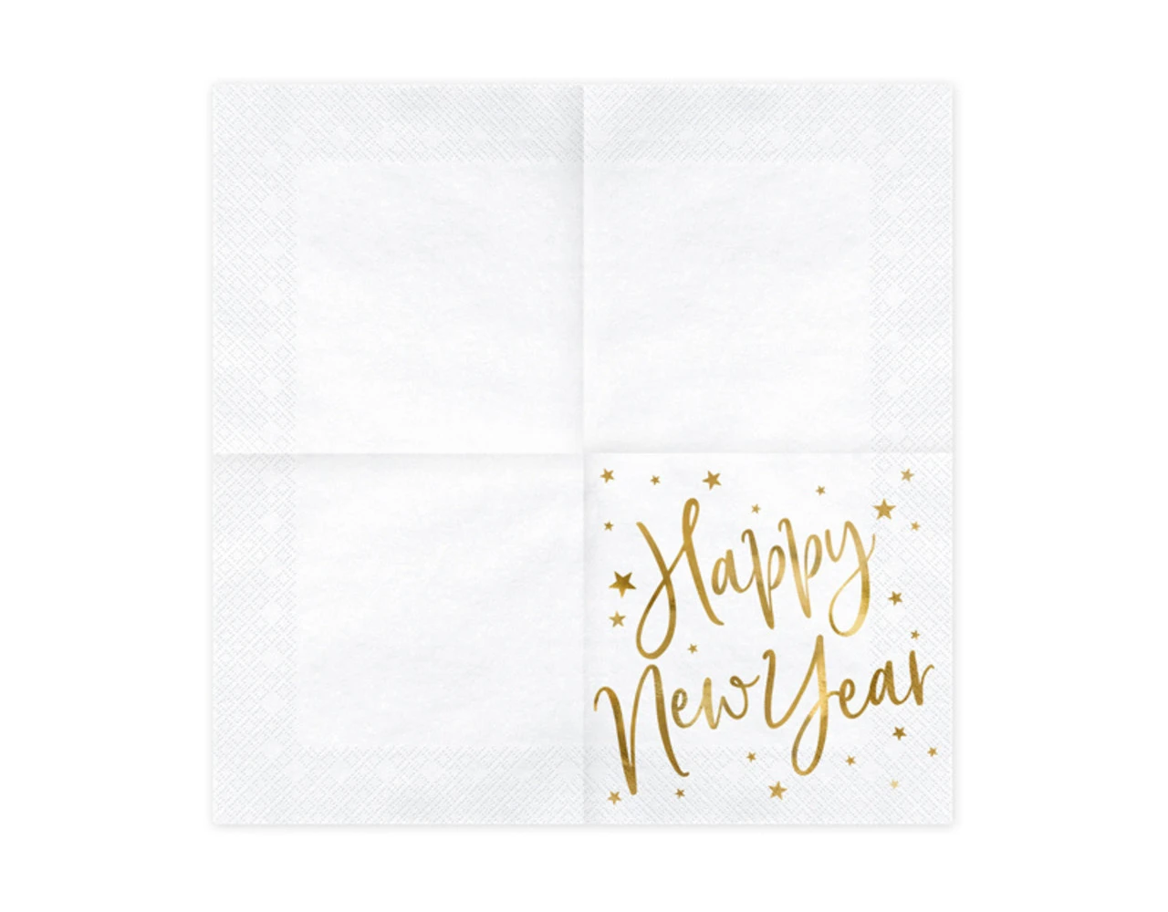 Papieren servetten in witte kleur met goudmetallic patroon van sterren en opschrift Happy New Year, afmeting na uitvouwen ca. 33 x 33 cm, afmeting na samenvoegen ca. 16,5 x 16,5 cm.