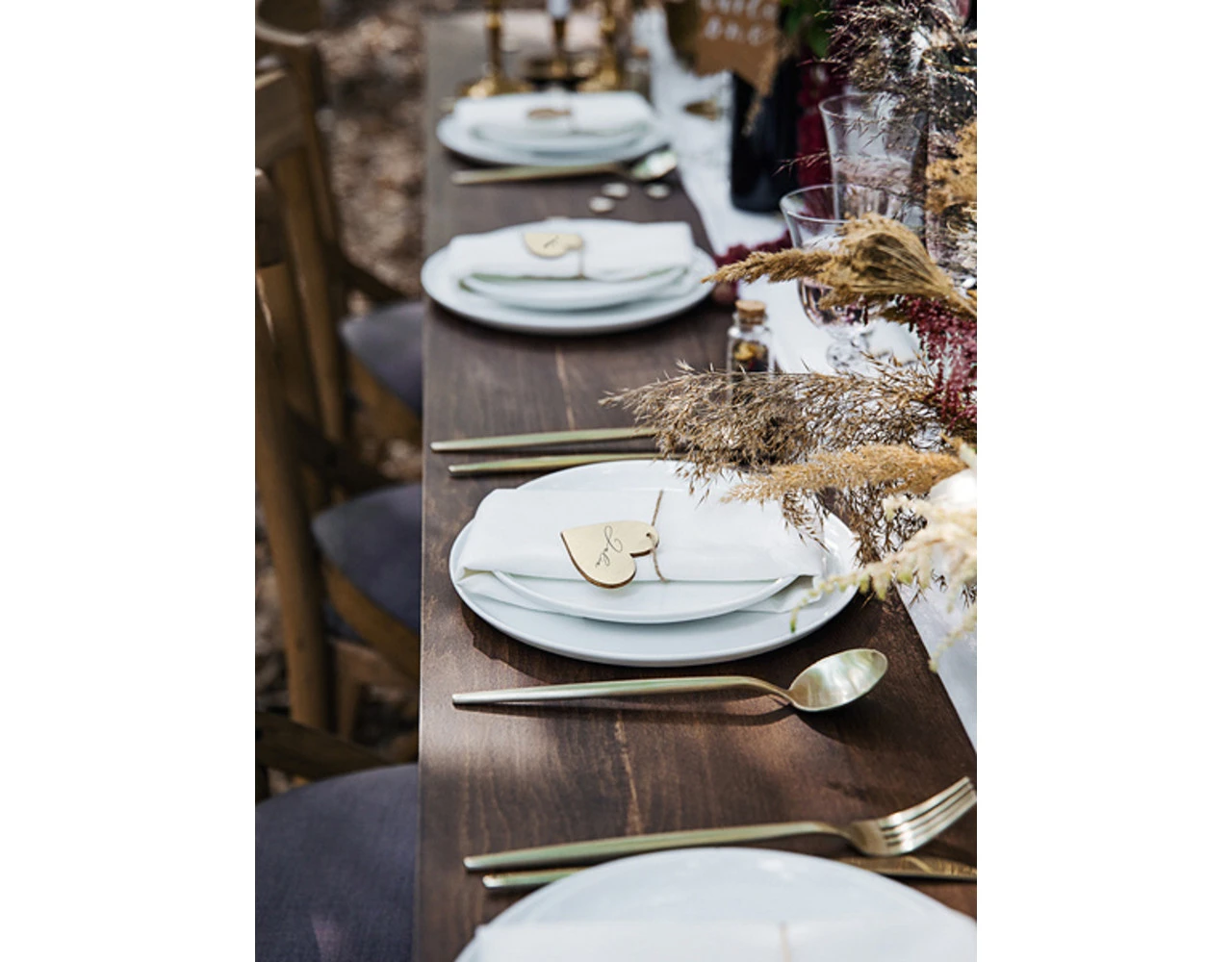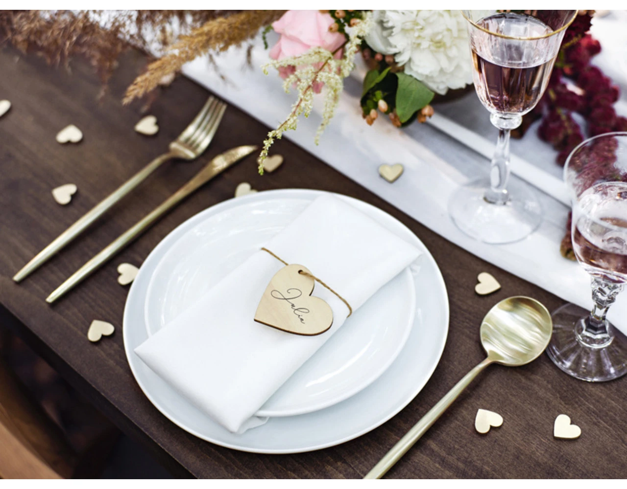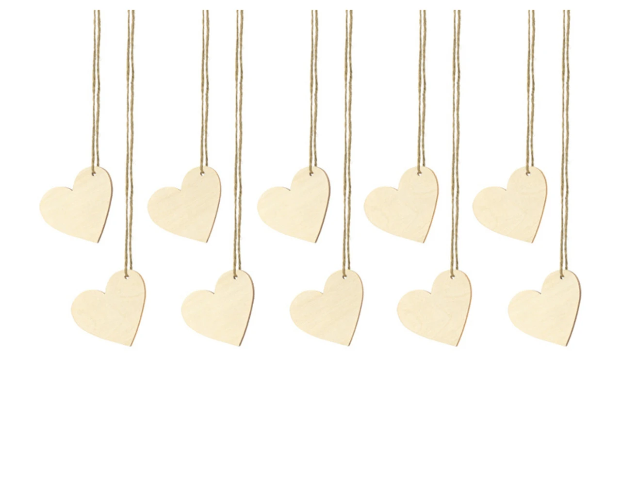 Plaatskaartjes Hartjes gemaakt van hout, set bevat kaartjes en ca. 2 m linnen koord, afmeting ca. 6 x 5 cm.
