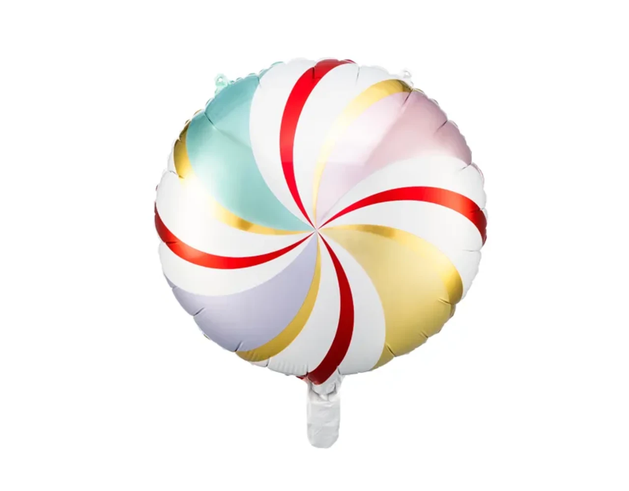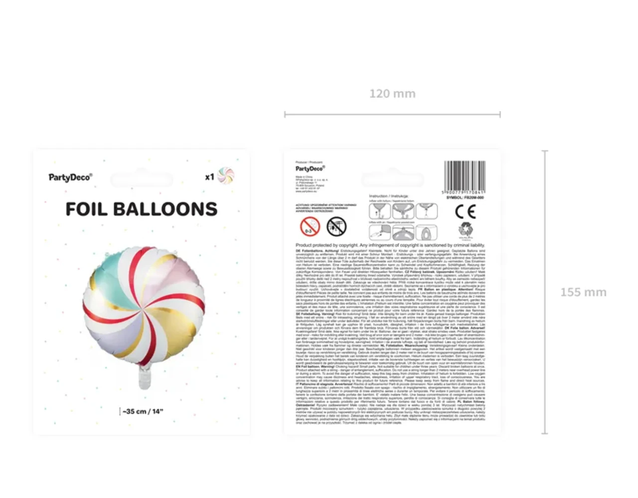 Glanzende folieballon Candy, mix van kleuren met goudmetallic opdruk, diameter voor opblazen ca. 45 cm (18”), diameter ca. 35 cm (14”). Opblazen met helium en lucht.