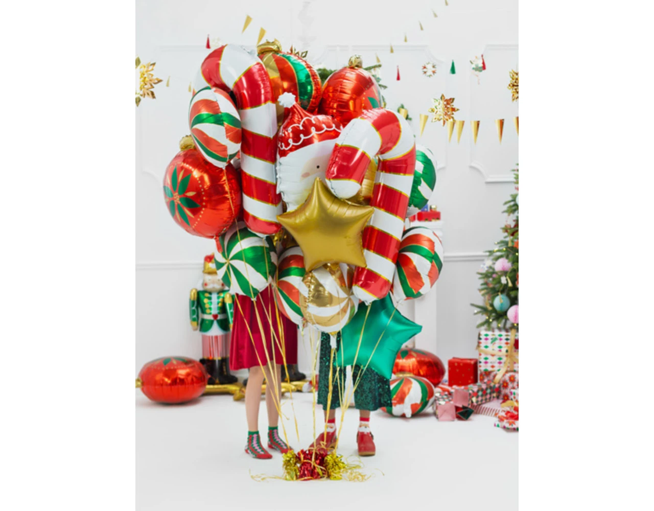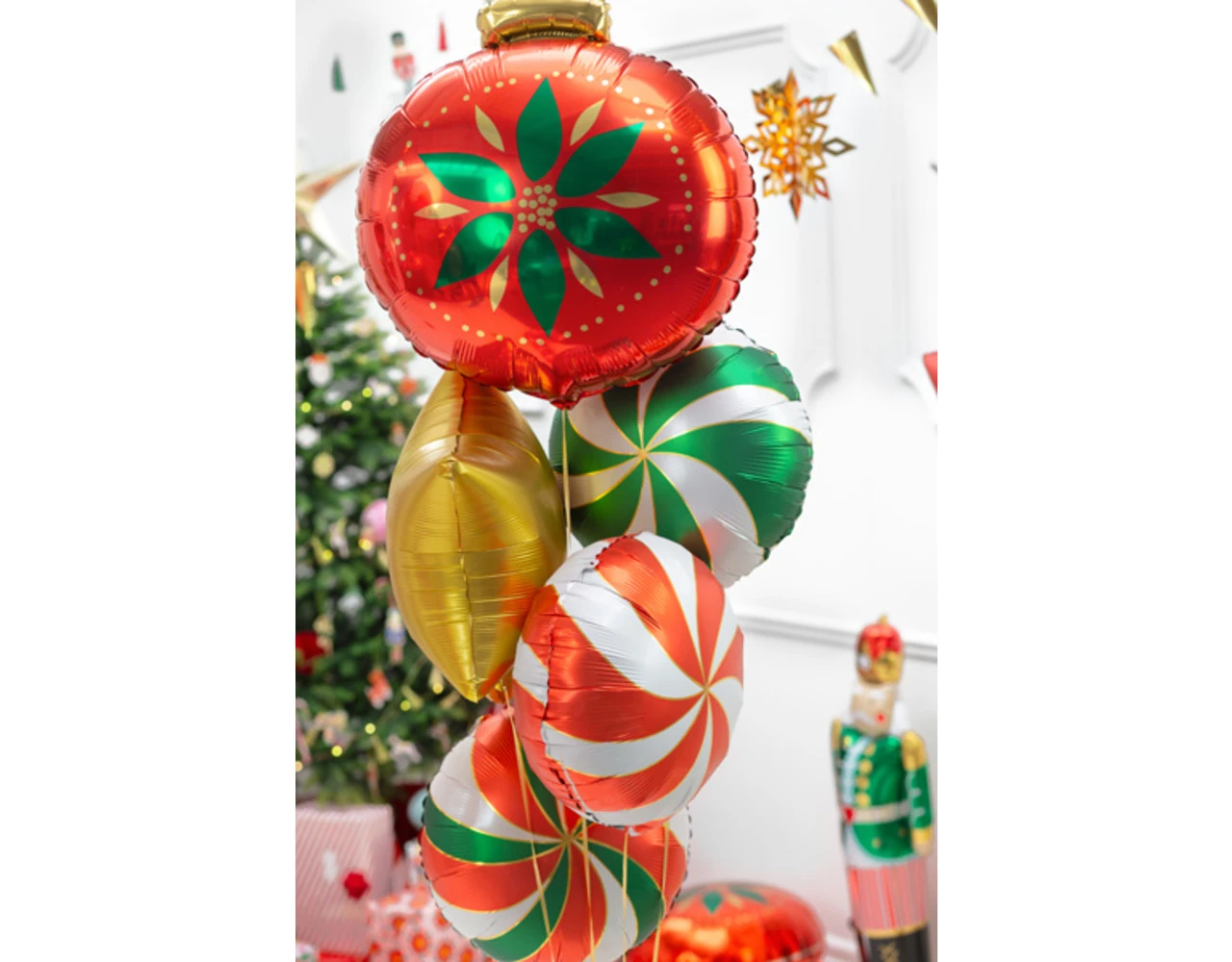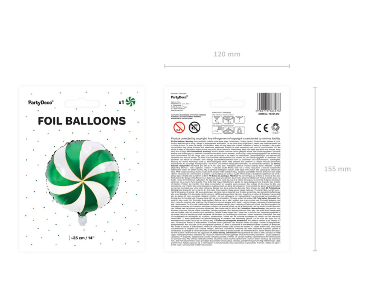 Matte folieballon Candy in witte kleur met groene en gouden satijnopdruk, diameter voor opblazen ca. 45 cm (18”), diameter na opblazen ca. 35 cm (14”). Opblazen met helium en lucht. Opblazen met helium en lucht.