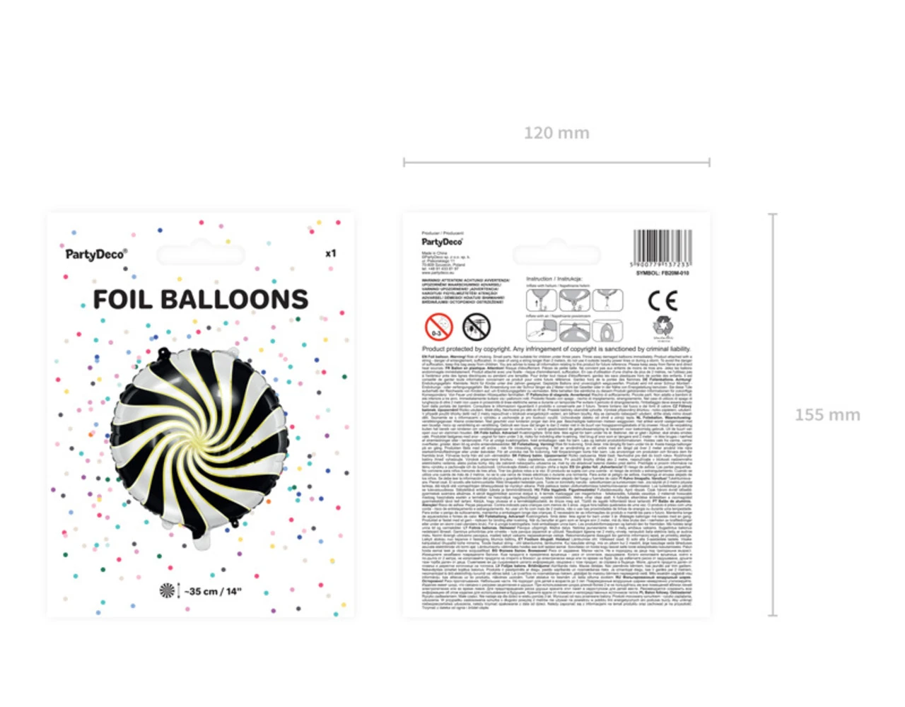 Glanzende folieballon Candy in witte kleur met zwarte opdruk, diameter voor opblazen ca. 45 cm (18”), diameter ca. 35 cm (14”). Opblazen met helium en lucht.