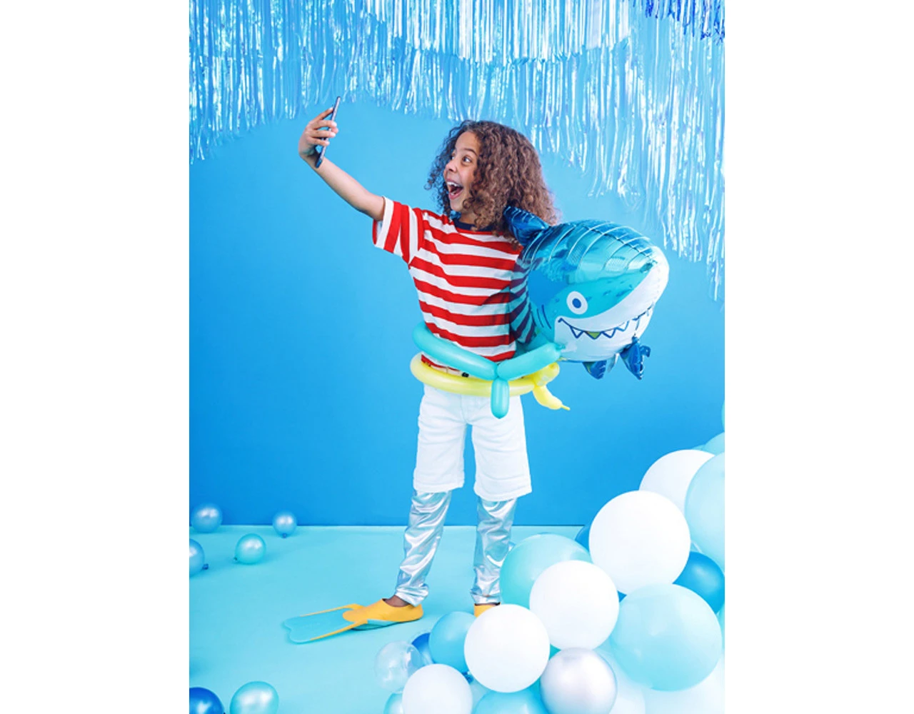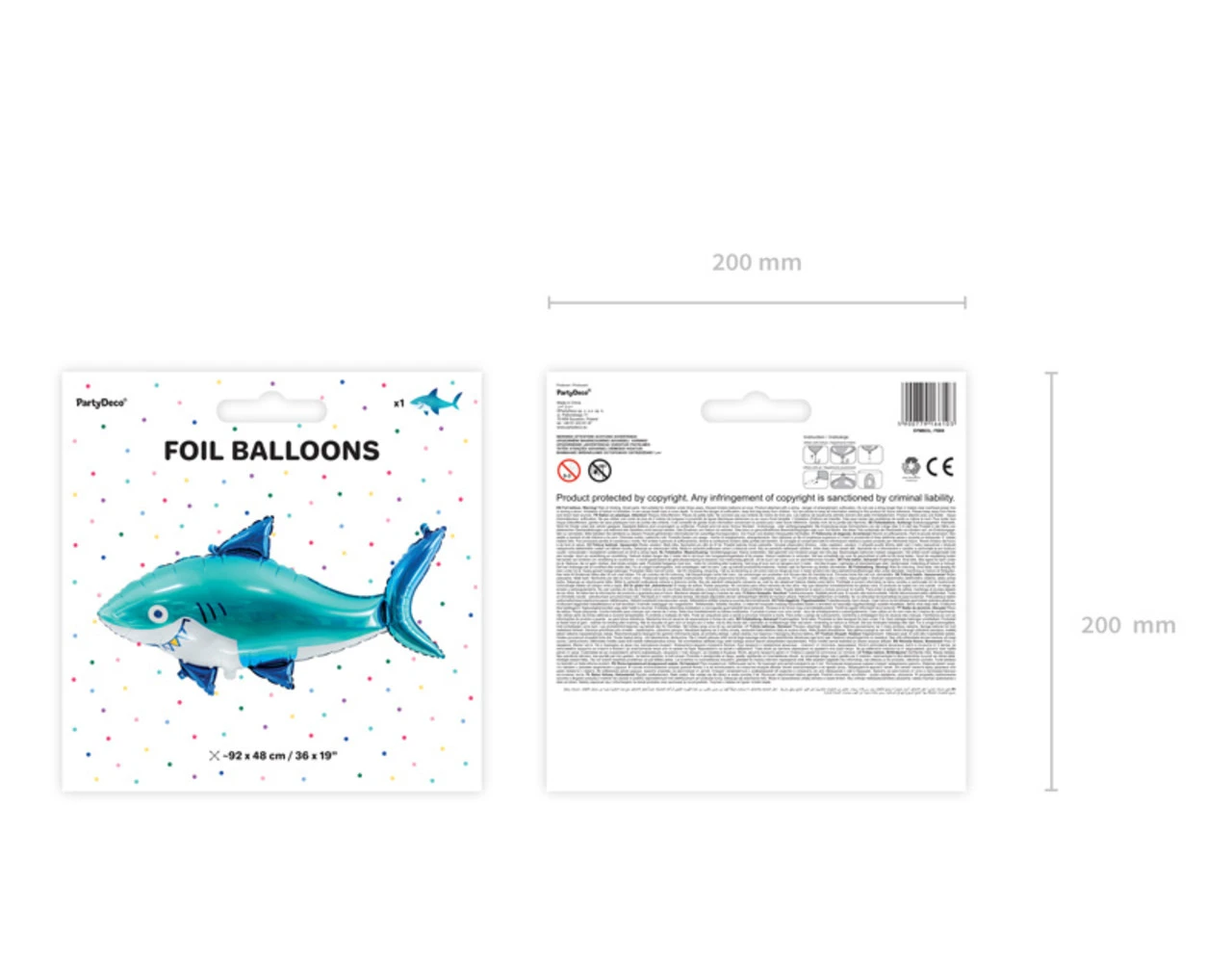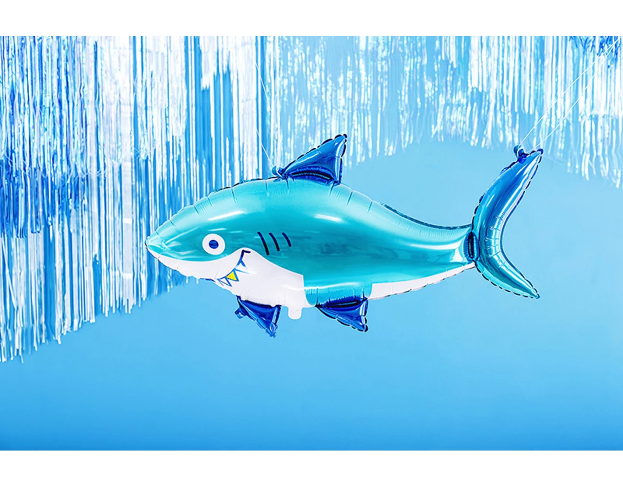Glanzende folieballon Shark, mix van kleuren, afmeting voor opblazen ca. 102 x 62 cm (40 x 24”), afmeting na opblazen ca. 92 x 48 cm (36 x 19”). Opblazen met lucht en helium.