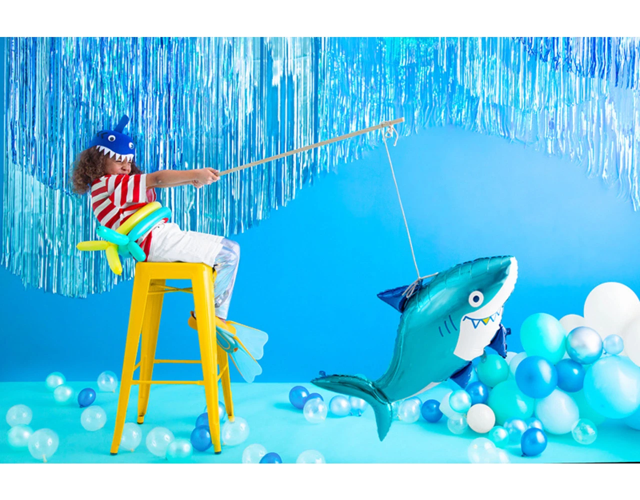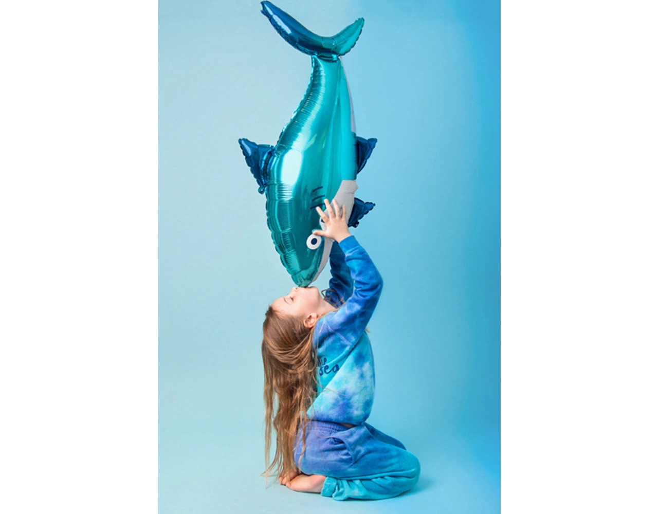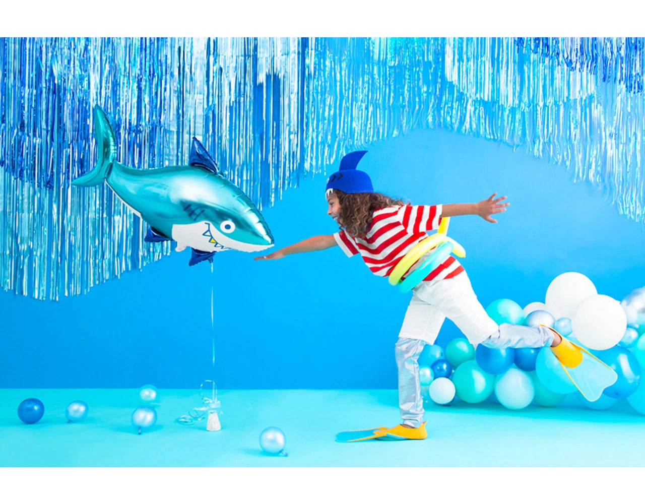 Glanzende folieballon Shark, mix van kleuren, afmeting voor opblazen ca. 102 x 62 cm (40 x 24”), afmeting na opblazen ca. 92 x 48 cm (36 x 19”). Opblazen met lucht en helium.