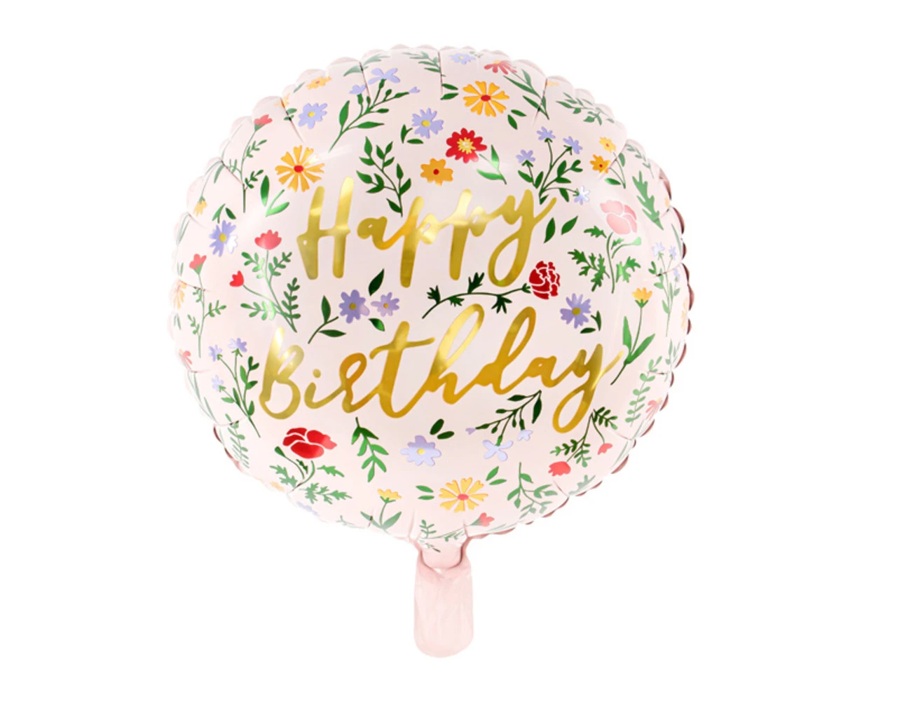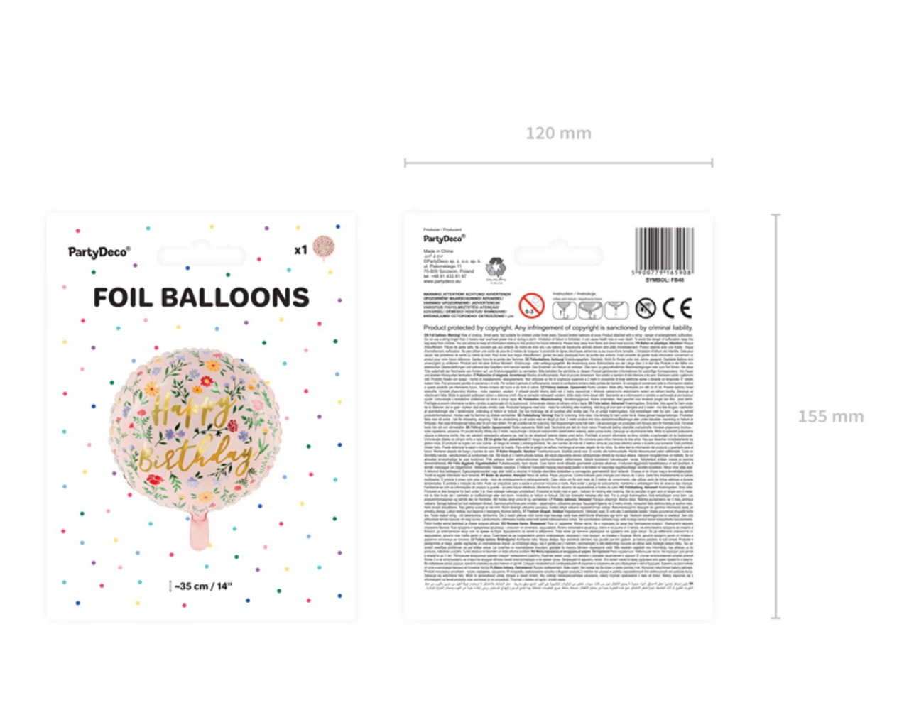 Matte folieballon in lichtroze kleur met kleurrijke matte opdruk en goudmetallic opschrift Happy birthday, diameter voor opblazen ca. 45cm, diameter na opblazen ca. 35 cm (14”). Opblazen met lucht en helium.