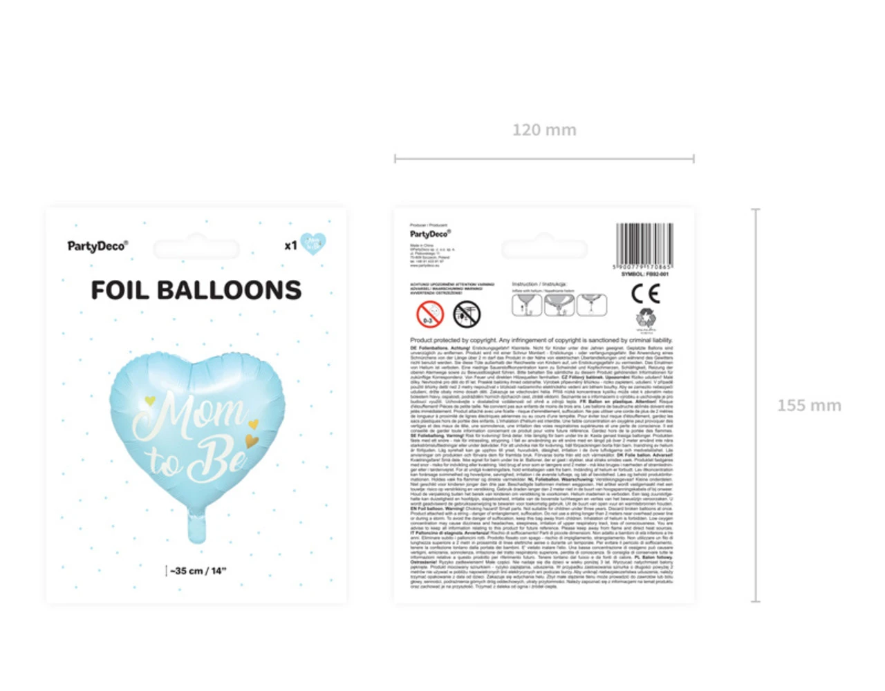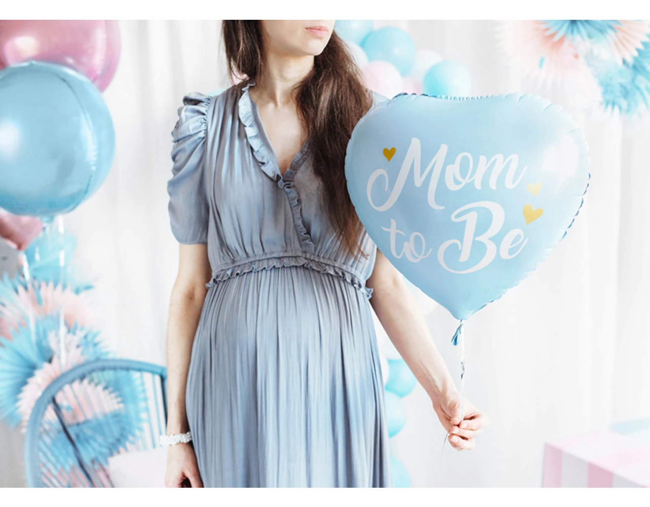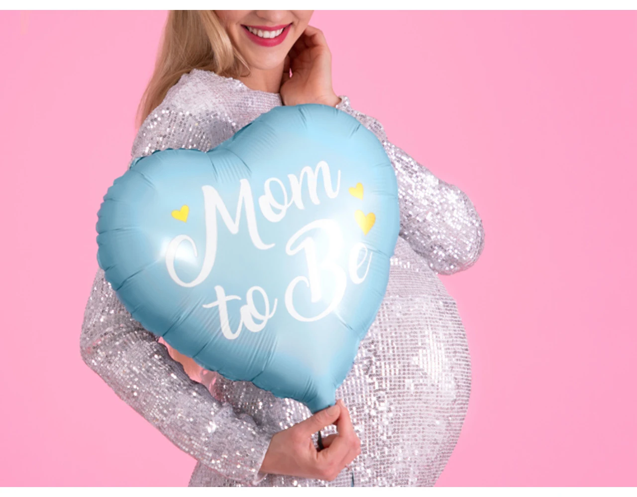 Glanzende folieballon in de vorm van een hart in blauwe kleur met goudmetallic opschrift Mom to Be, diameter voor opblazen ca. 45 cm, diameter ca. 35 cm. Opblazen met helium.