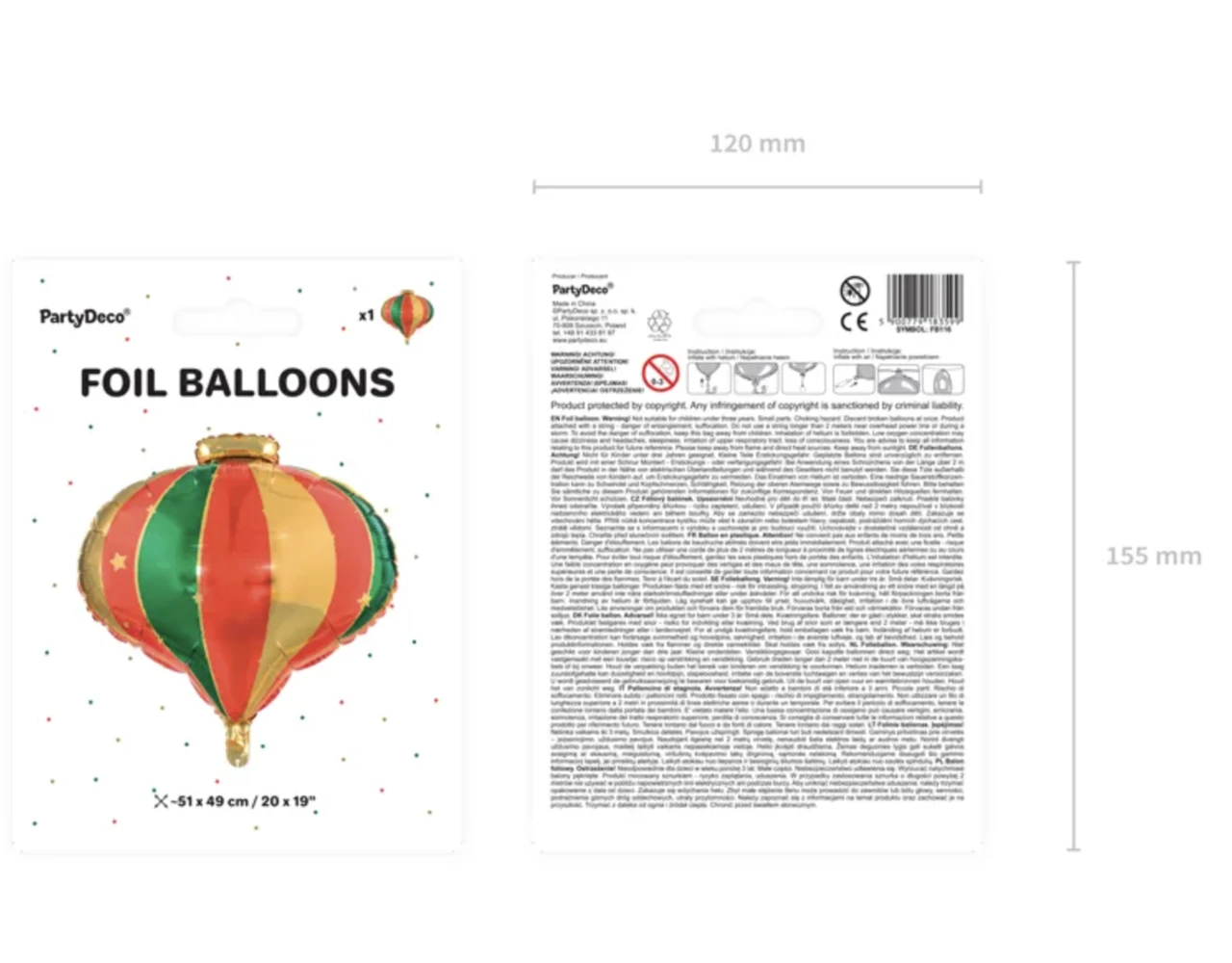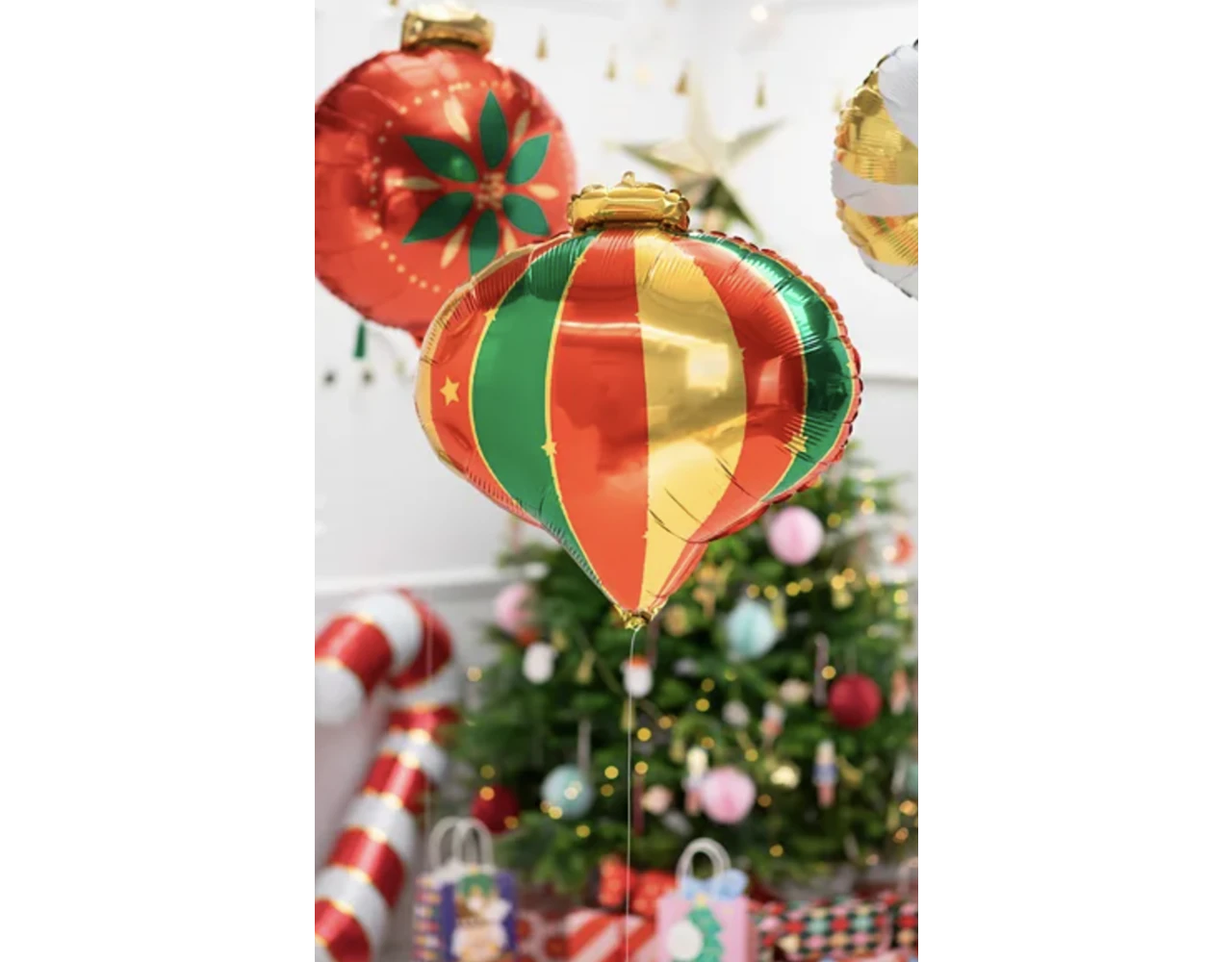 Matte folie ballon kerstbal in rode kleur met groen en goud metallic print, afmeting ca. 51 x 49 cm (20 x 19 ”).