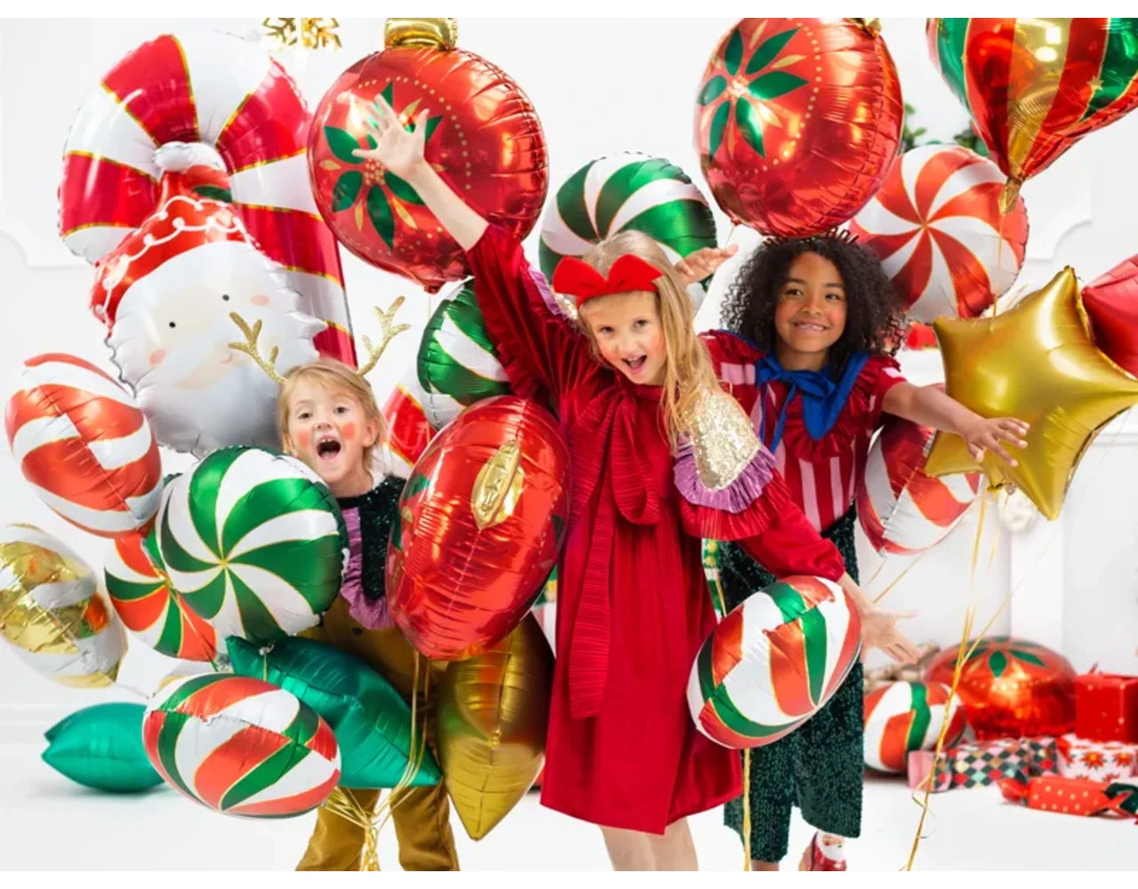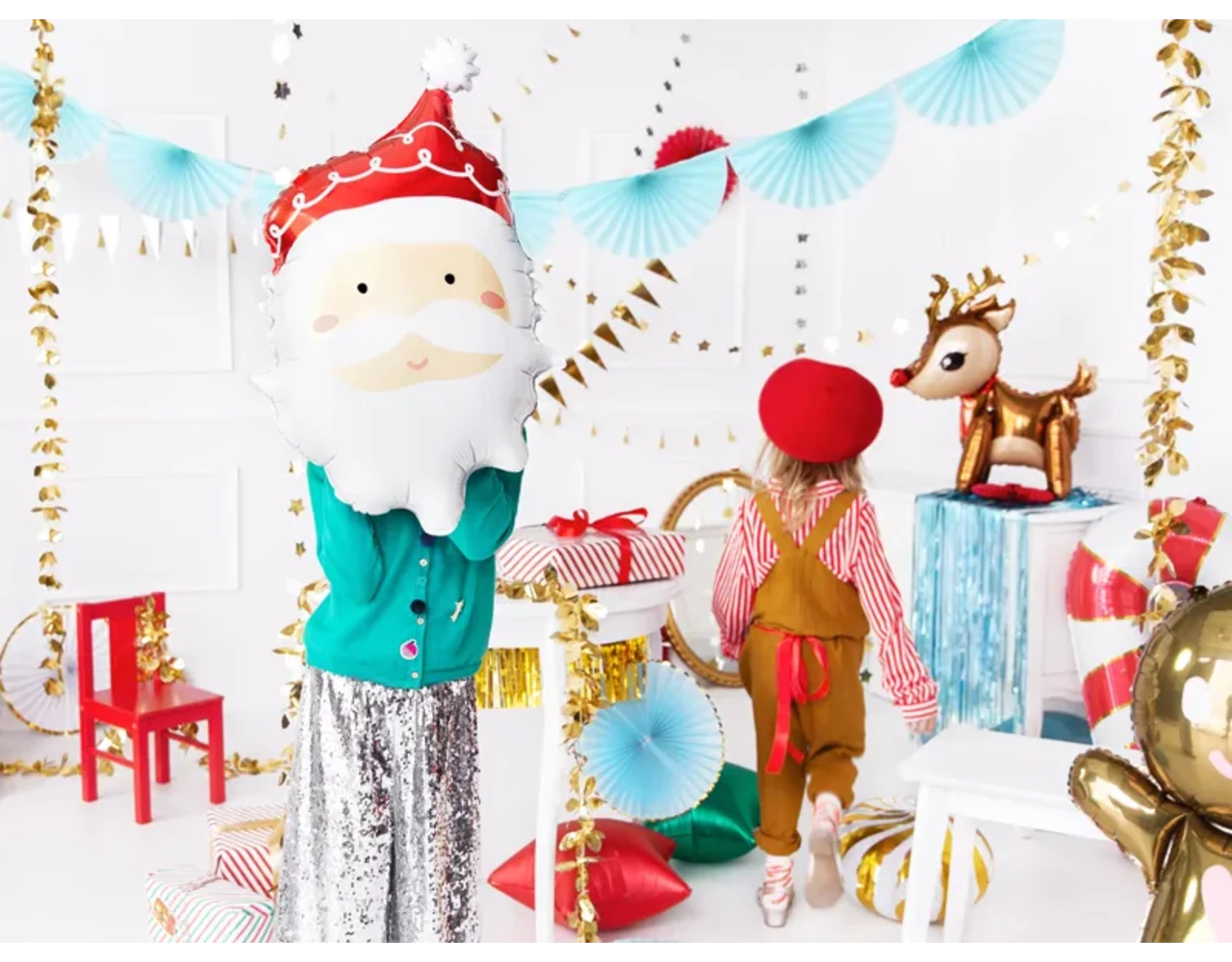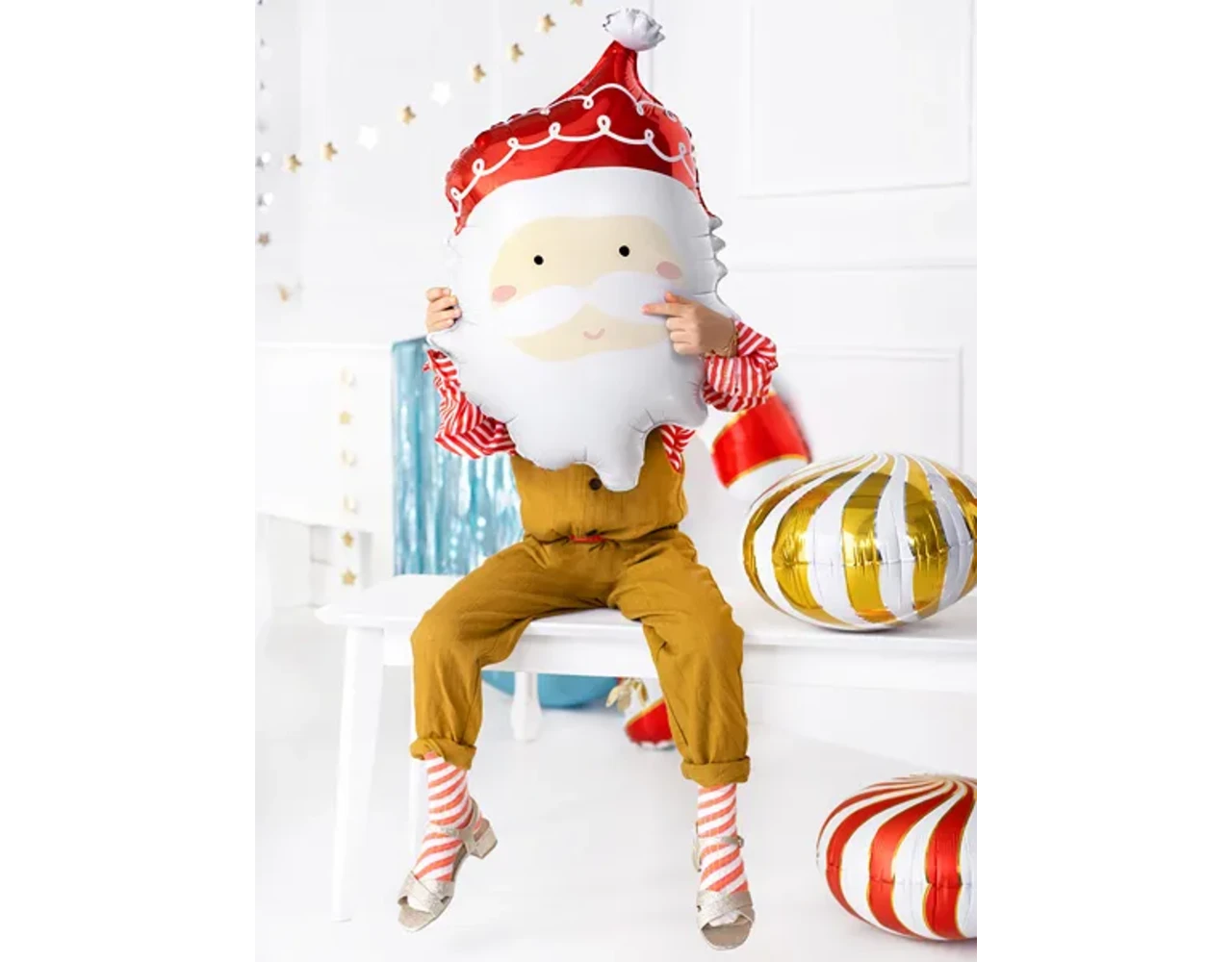 Glanzende folieballon in de vorm van de Kerstman, mix van kleuren, afmeting voor opblazen ca. 50 x 70 cm (20 x 27”), afmeting na opblazen ca. 37 x 60 cm (14,5 x 23,5”). Opblazen met lucht en helium.