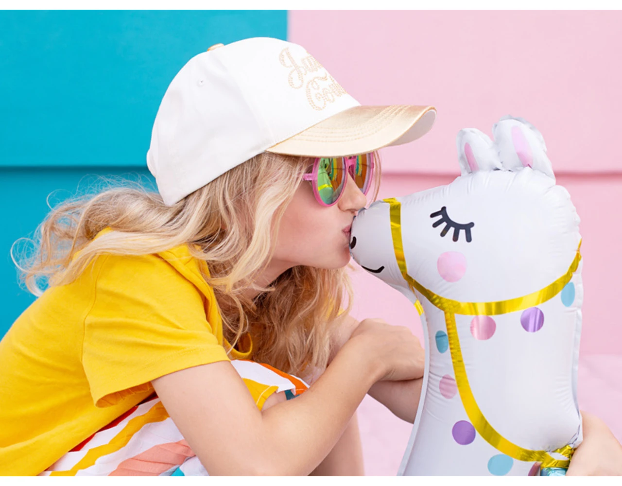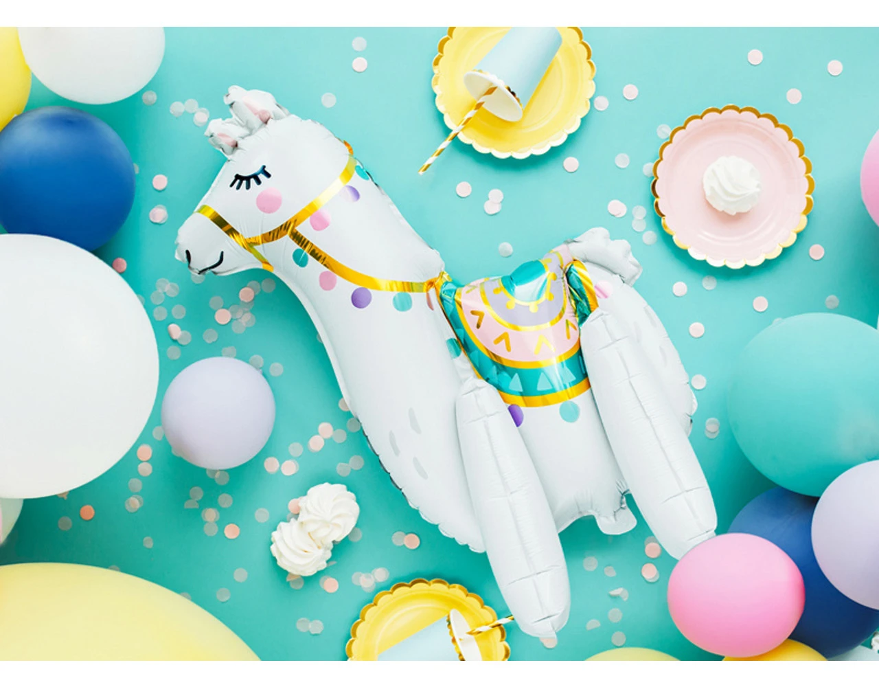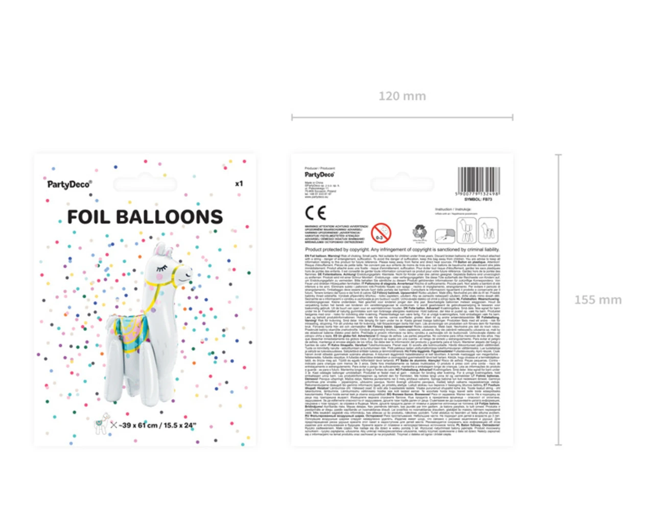 Matte folieballon Llama in witte kleur met kleurrijke opdruk, formaat ca. 39 x 61 cm (15,5 x 24”).