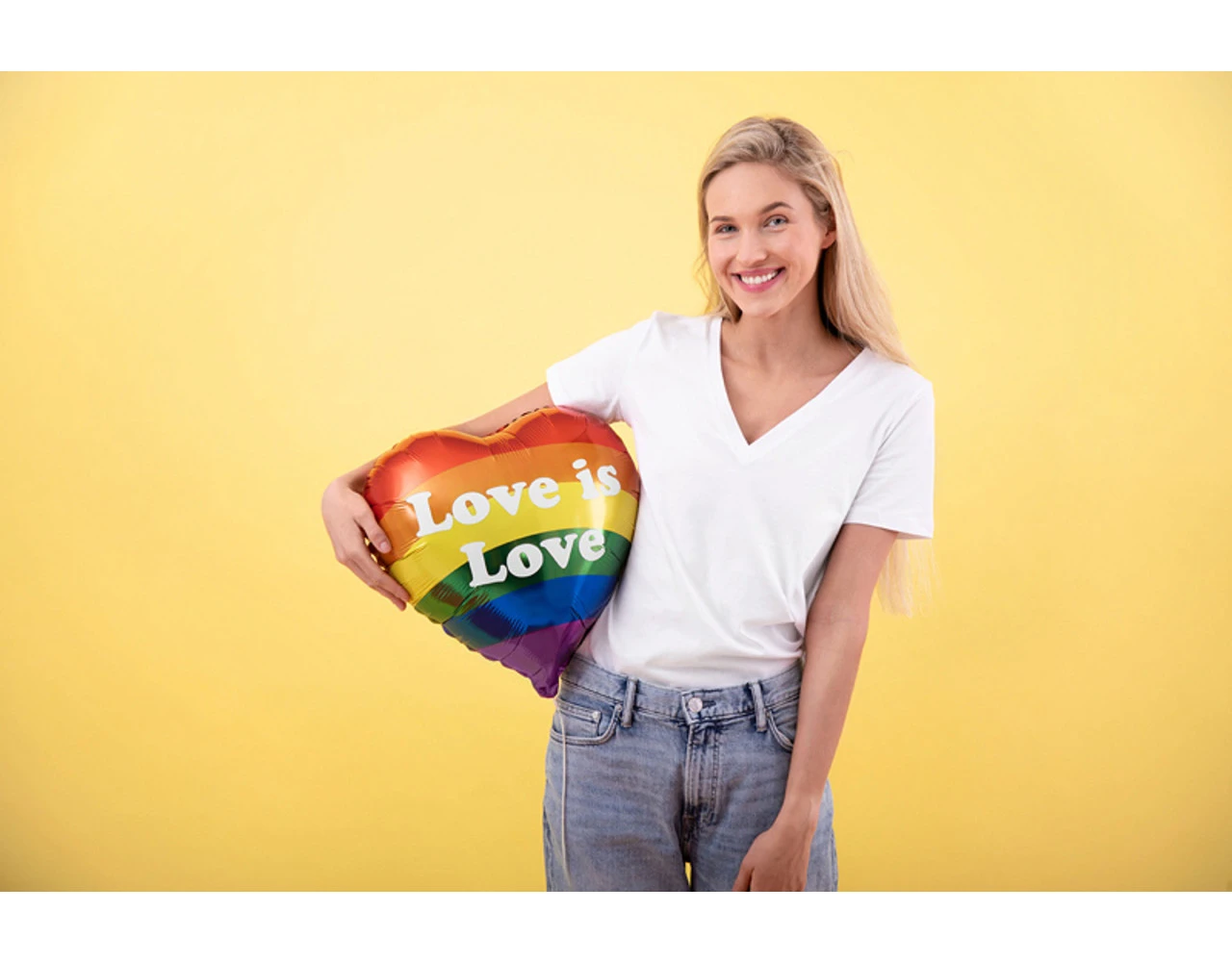 Matte folieballon in de vorm van een hart, mix van kleuren met wit glanzend opschrift Love is Love, afmeting voor opblazen ca. 45 cm (18”), afmeting na opblazen ca. 35 cm (14”). Opblazen met helium.