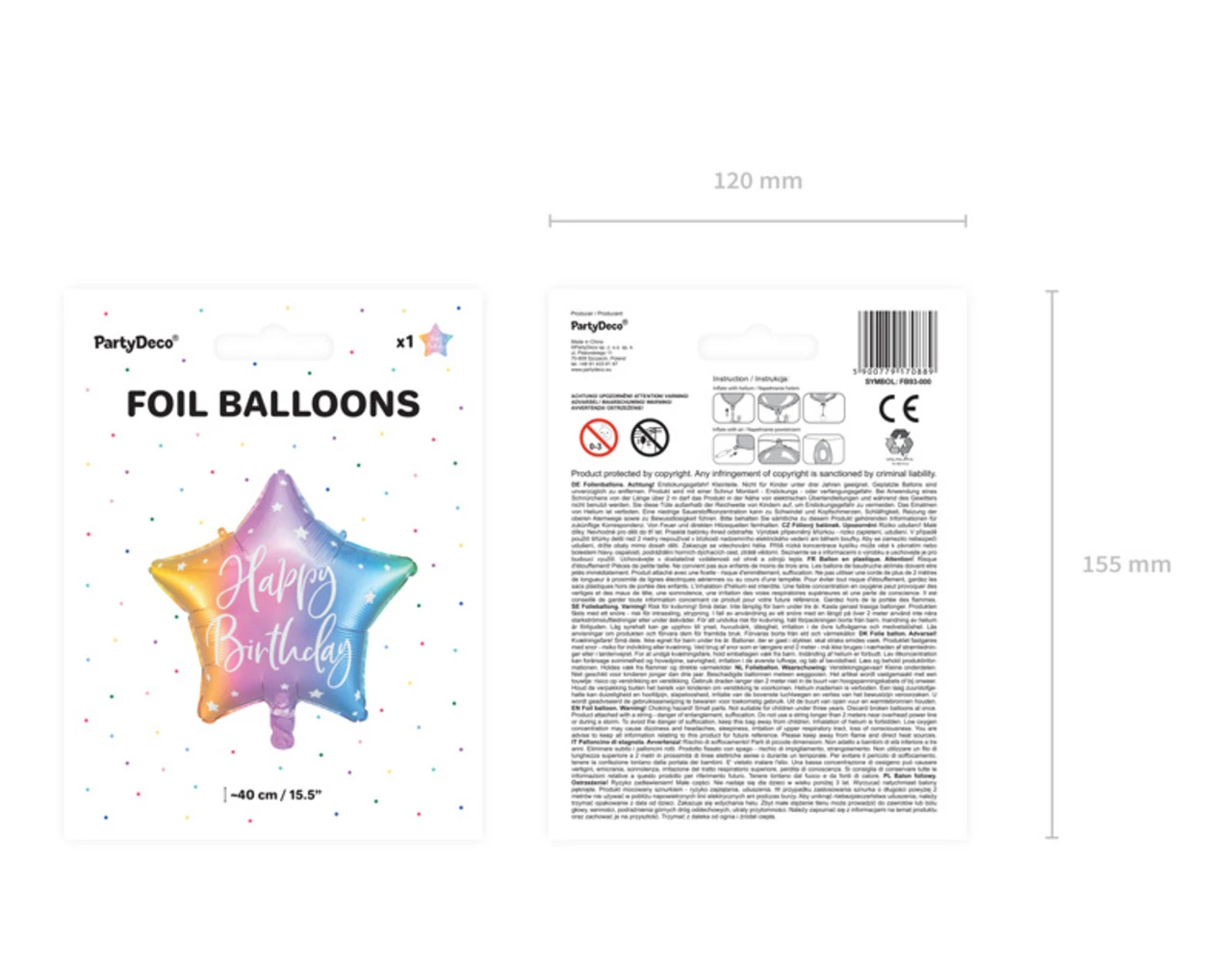 Glanzende folieballon in de vorm van een ster, mix van kleuren met wit opschrift Happy Birthday, afmeting voor opblazen ca. 47 cm, afmeting na opblazen ca. 40 cm. Opblaasbaar met helium en lucht.