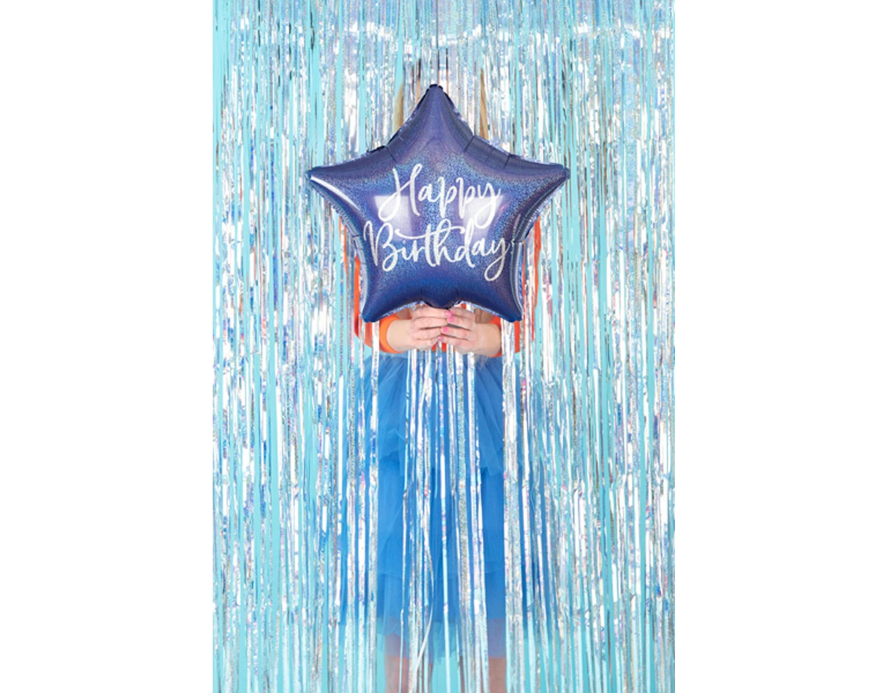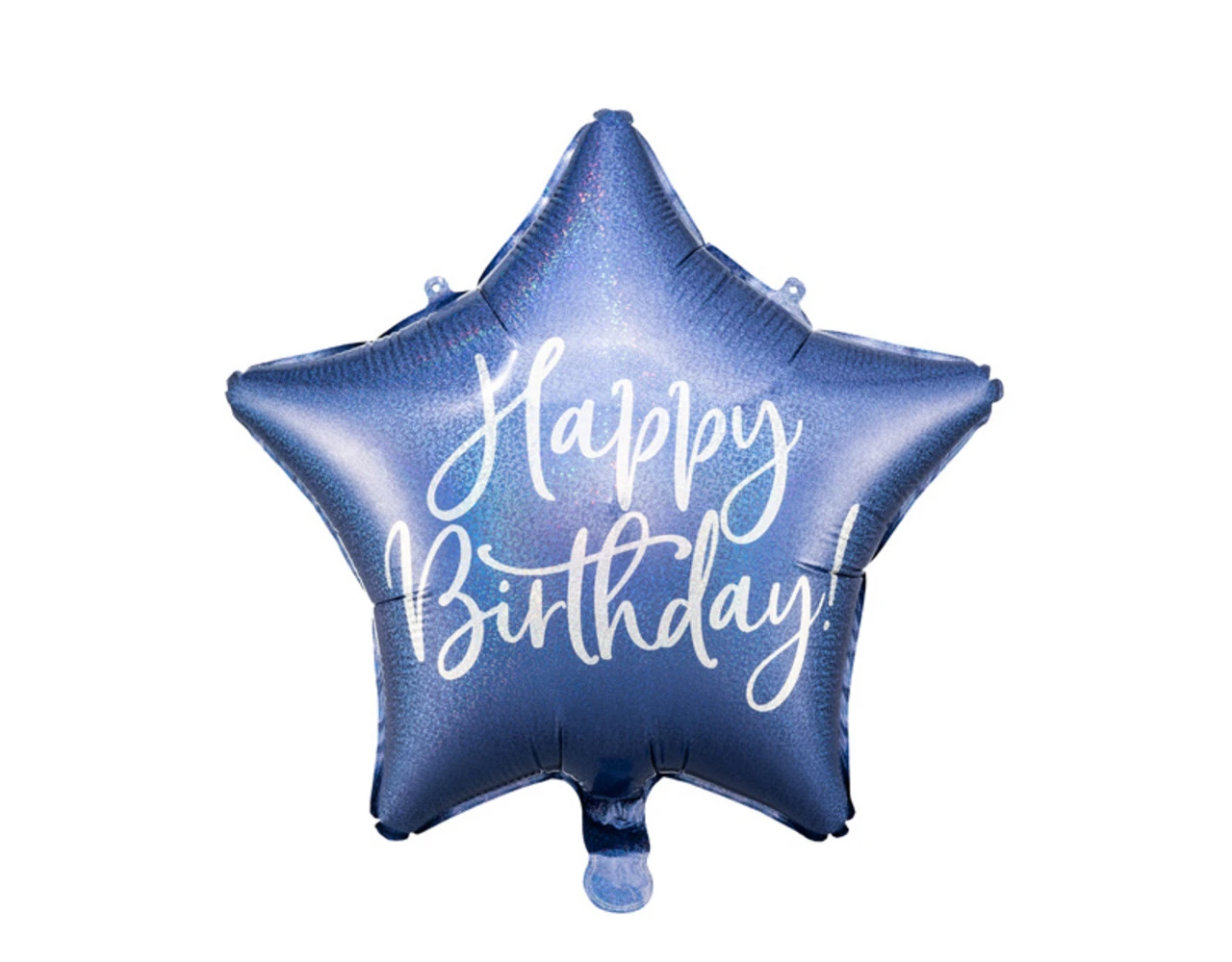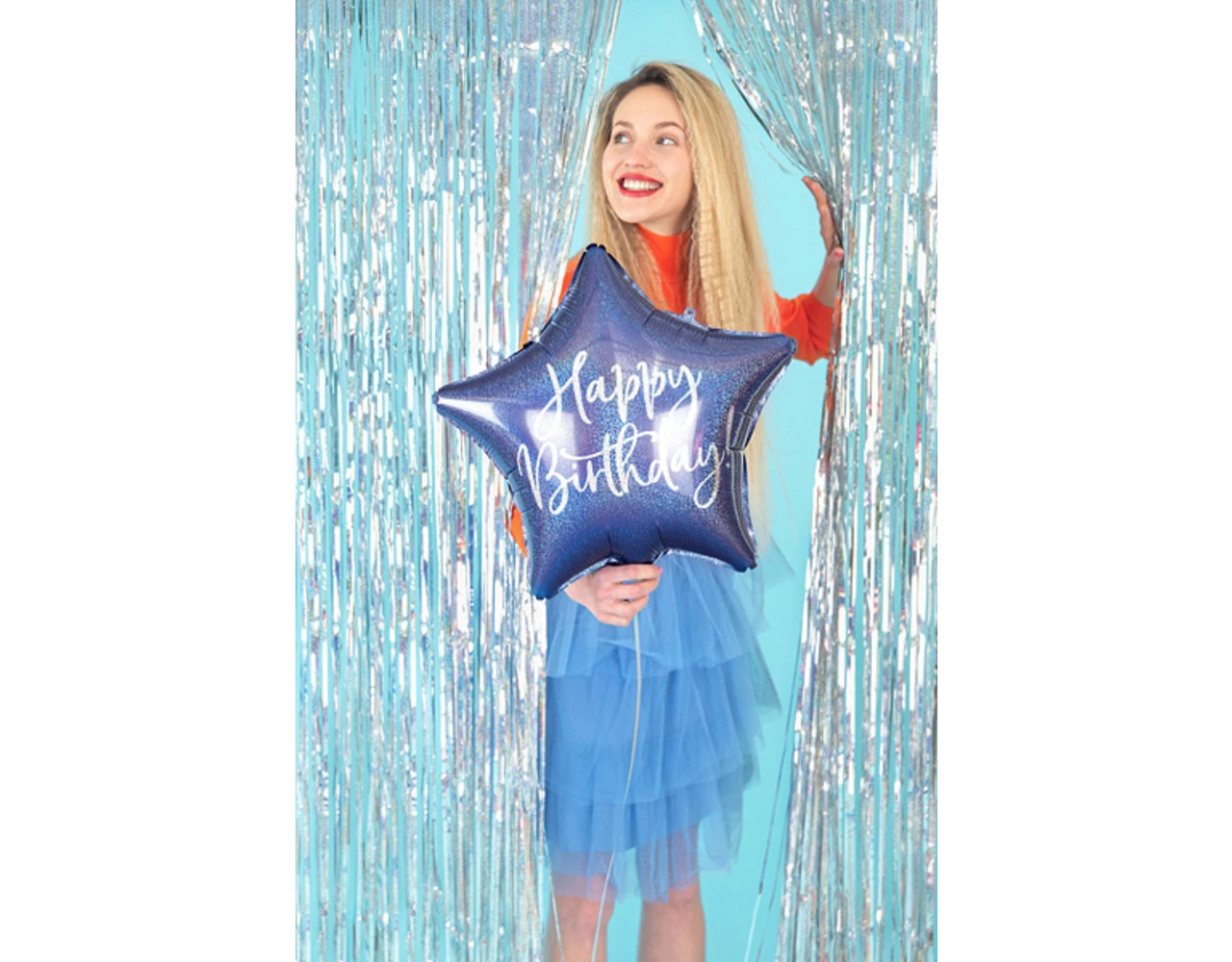 Glanzende folieballon in de vorm van een ster in marineblauwe kleur met iriserende inscriptie Happy Birthday, afmeting voor opblazen ca. 47 cm (18.5”), afmeting na opblazen ca. 40 cm (15.5”). Opblazen met helium en lucht.