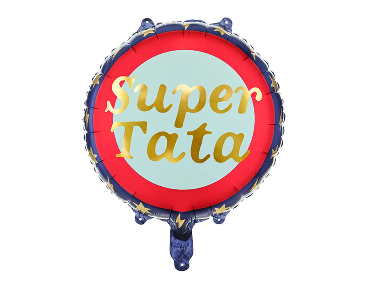 Folieballon Super Tata, mix van kleuren, afmeting: hoogte voor opblazen ca. 45 cm (18”), hoogte na opblazen ca. 35 cm (14”). Op te blazen met lucht en helium. Set bevat een rietje.