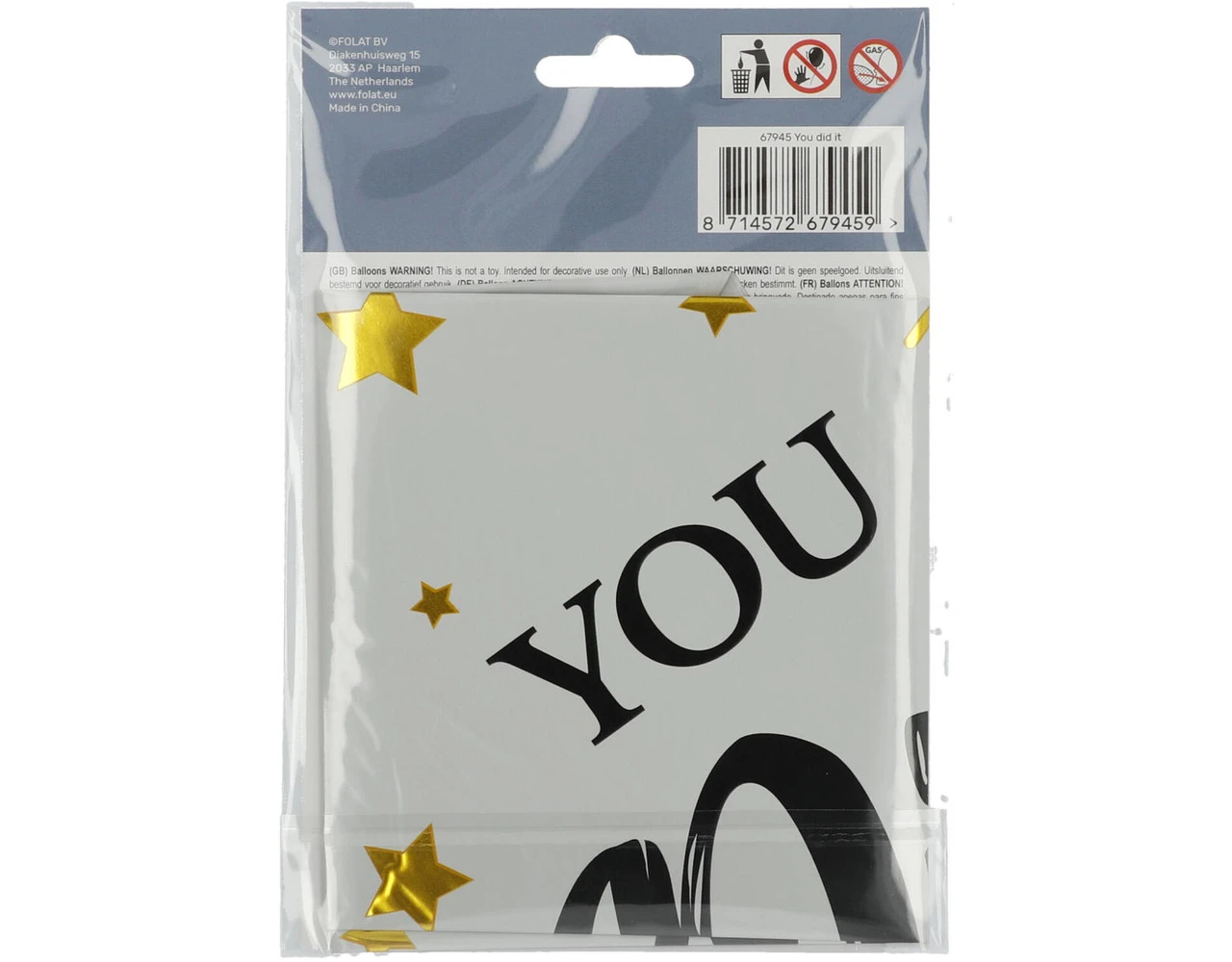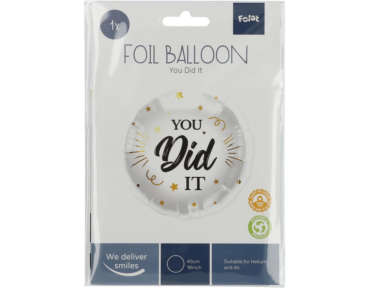 Folieballon You Did It – 45 cm. Inhoud: 1 folieballon. Kleur: Wit. Bijvoorbeeld te gebruiken tijdens de volgende feestgelegenheid/feestgelegenheden: Geslaagd. Deze folieballon is 18 inch/45 cm. Het artikel is gemaakt van folie.