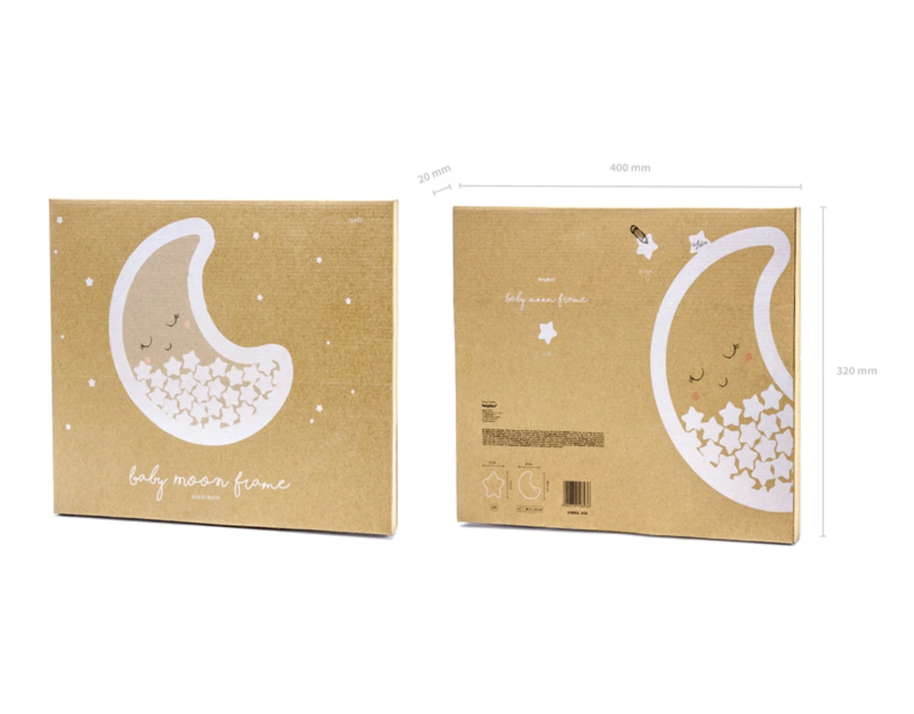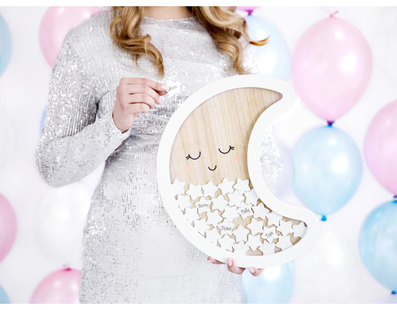 Houten gastenboek, set bevat gastenboek in de vorm van maan en 30 witte sterren om in te schrijven, afmeting ca. 38,5 x 30 cm.