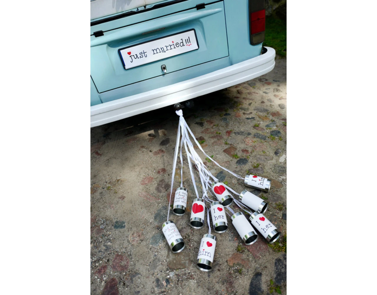 Bruiloftblikjes voor autodecoratie, met witte linten en een vrij tekstveld, formaat 14×7 centimeter.