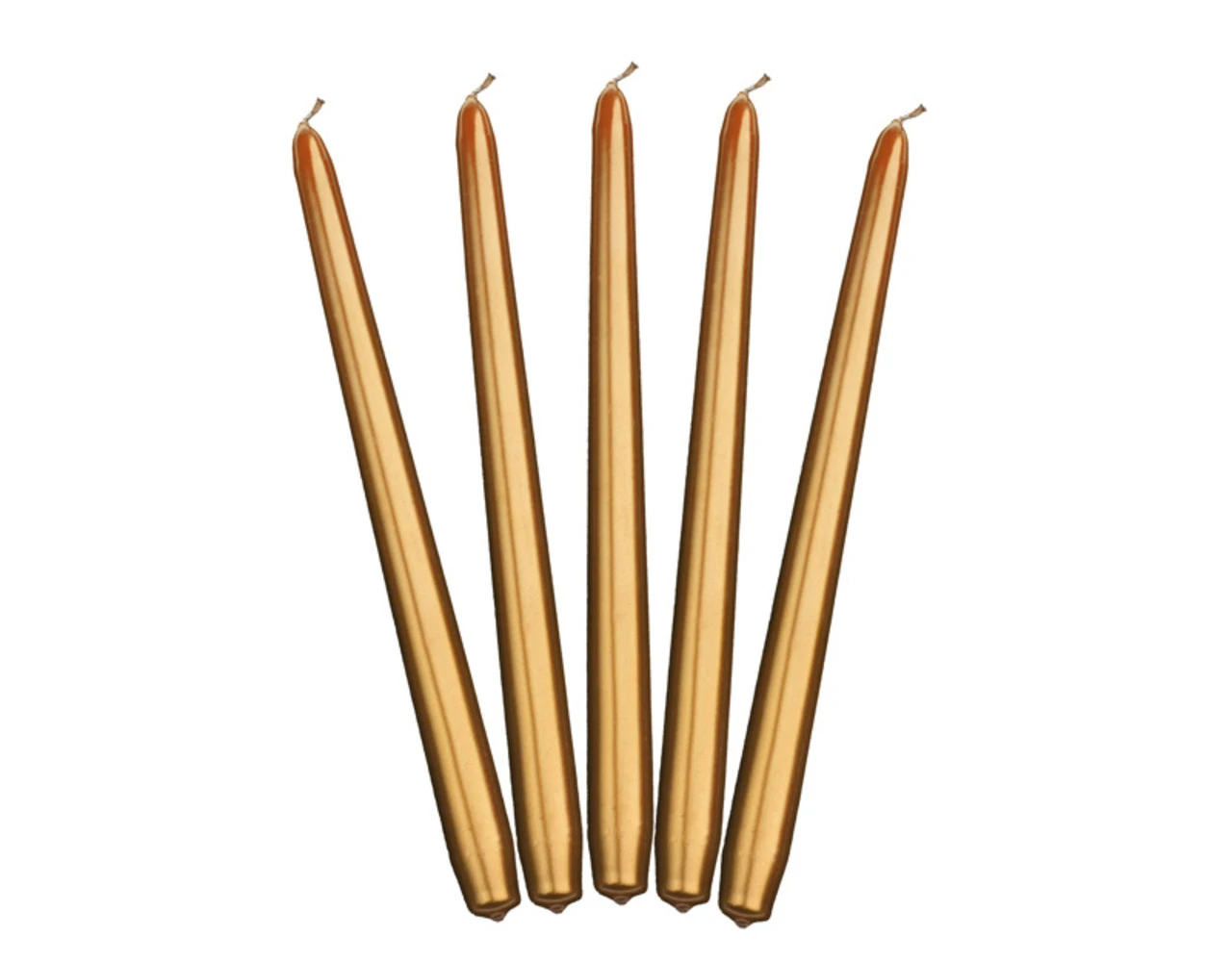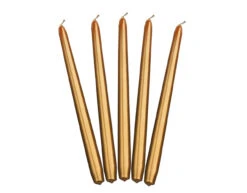 Kegelkaarsen, metallic, goud, hoogte 29 centimeter. Brandduur van 1 stuk ca. 8 uur.