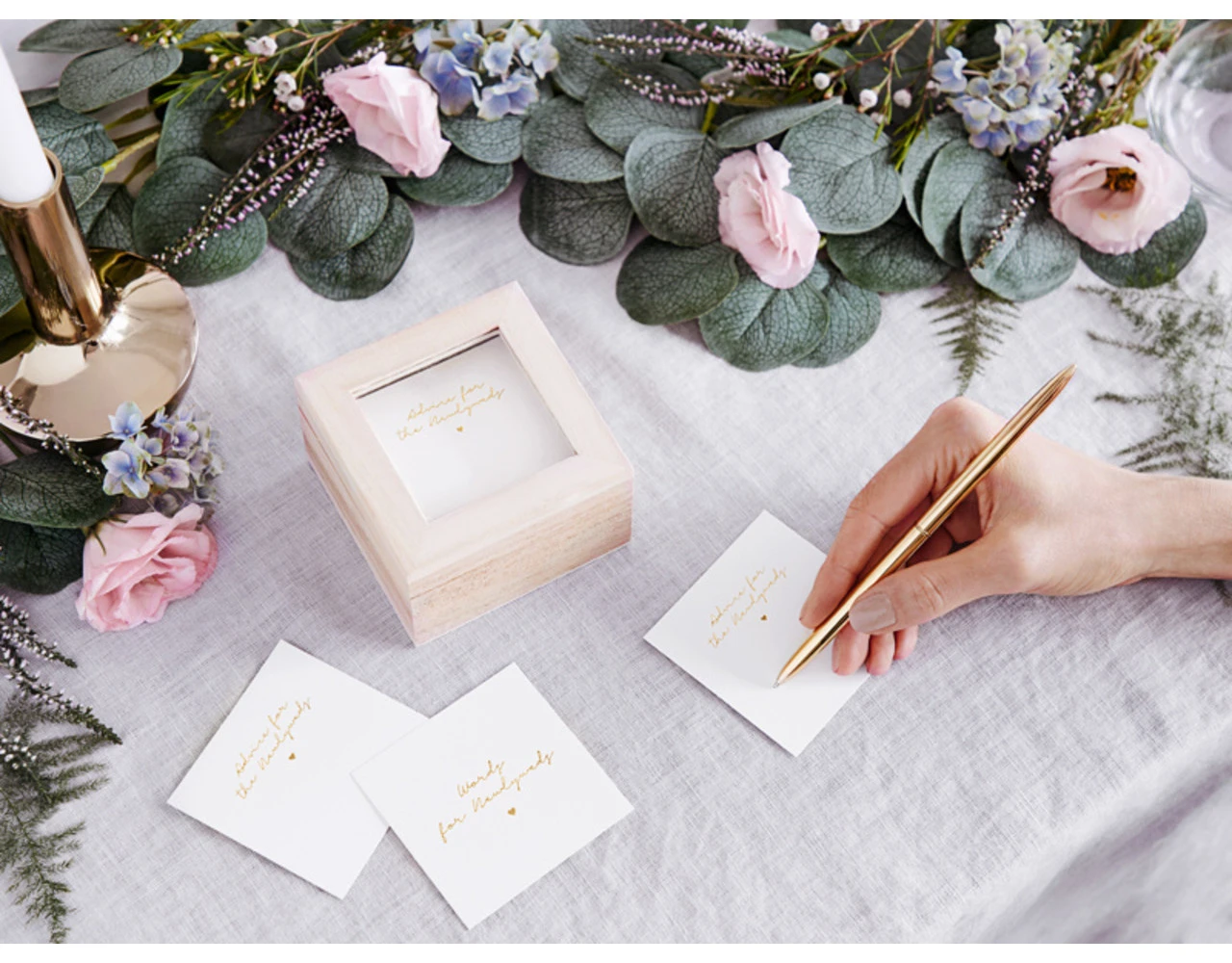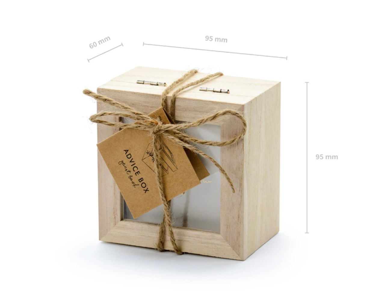 Gastenboek – trouwadviesdoos, set bevat houten doosje afgesloten door een glazen magneetdeksel (afmetingen ca. 9,5 x 9,5 x 6 cm) en witte kaartjes met een gouden inscriptie om in te vullen (100 stuks). Product in Engelse taalversie.