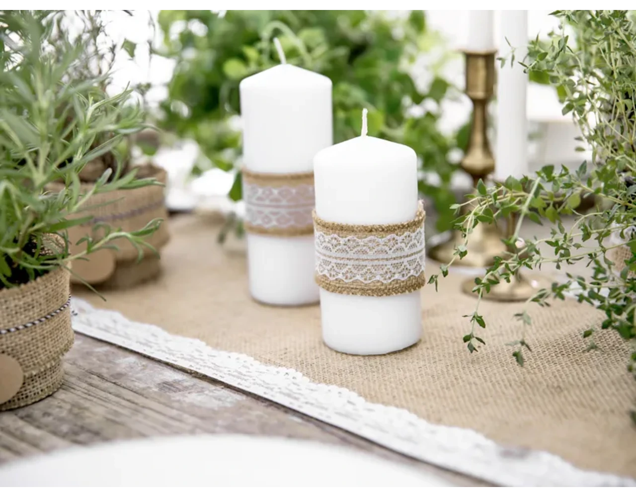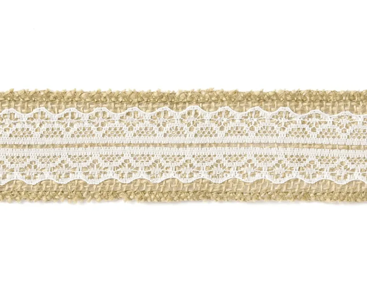 Jute band met witte kant, breedte ca. 4 cm, lengte ca. 5 m.