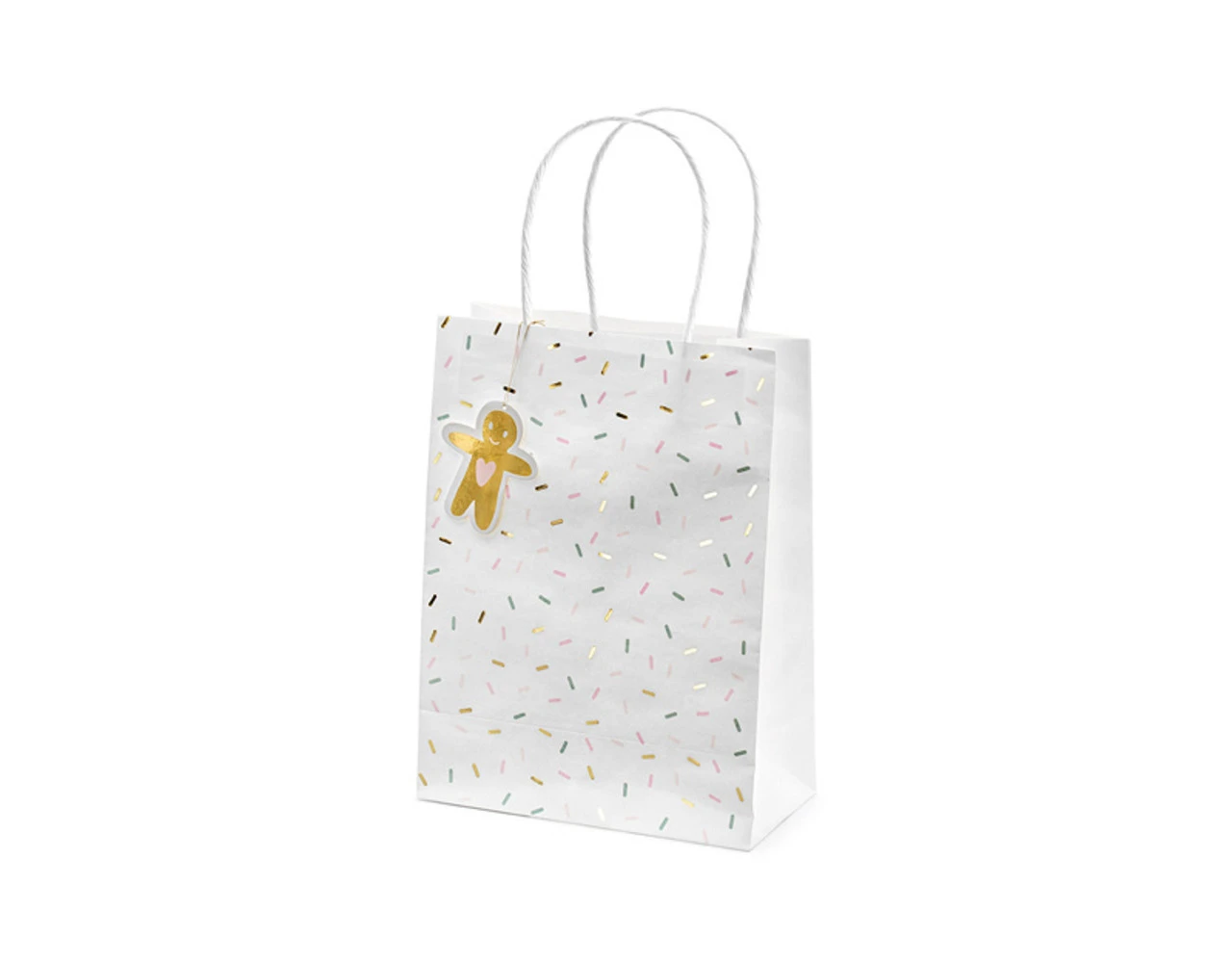 Kerstcadeauzakjes, mix van kleuren en dessins (set bevat 1 stuk van elk dessin), afmetingen ca. 14 x 18 x 8 cm, 20 x 27 x 10 cm, 24 x 32 x 10 cm. Elk zakje bevat een label om in te schrijven.