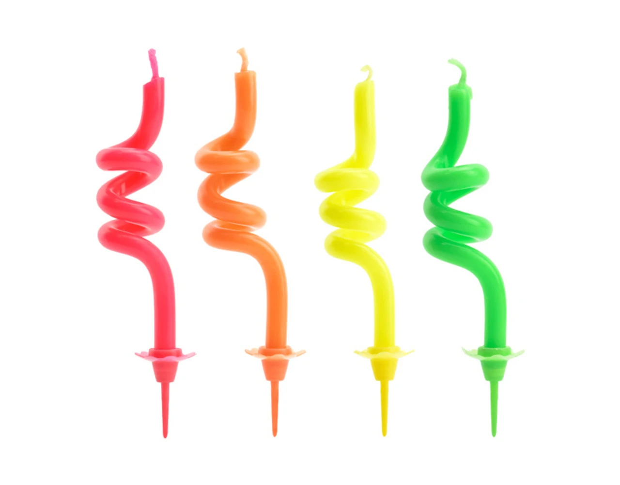 Verjaardagskaarsjes krullen, mix van kleuren, hoogte ca. 8 cm. Set bestaat uit kaarsen en houders.