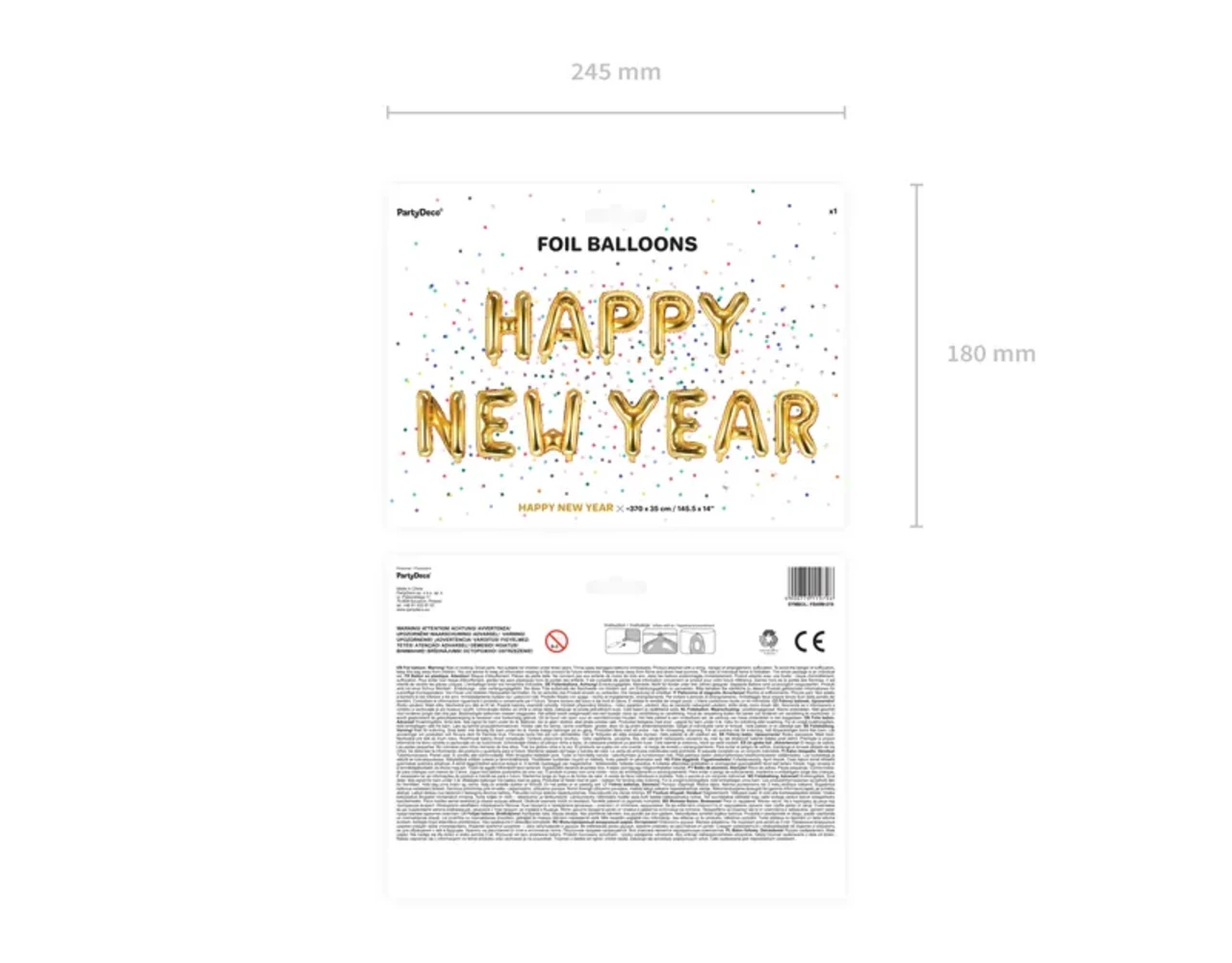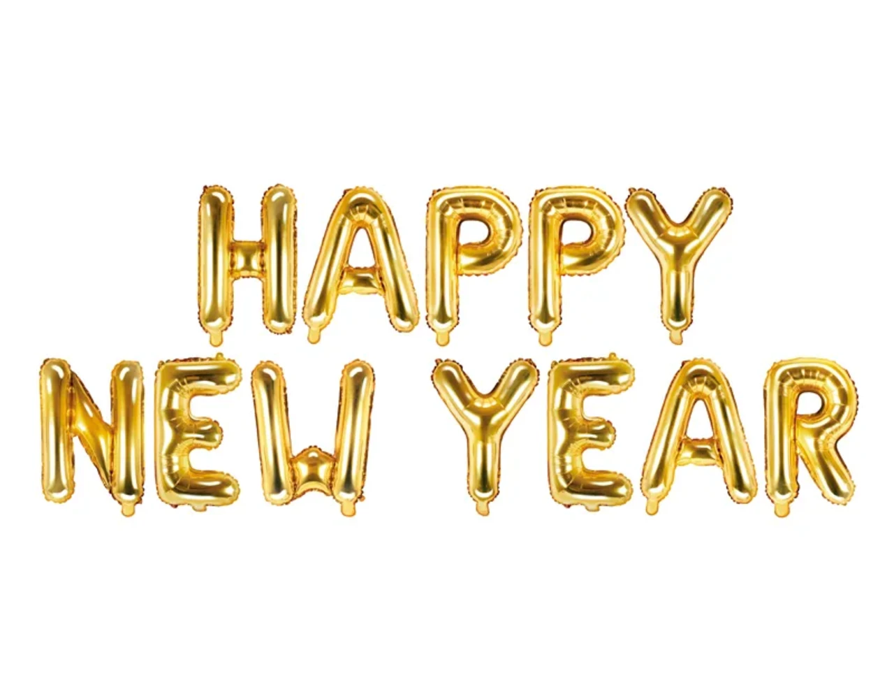 Metallic folieballon Happy New Year in goudkleur, afmeting voor opblazen ca. 422 x 46 cm (166 x 18”), afmeting na opblazen ca. 370 x 35 cm (145,5 x 14”). Opblazen met lucht.