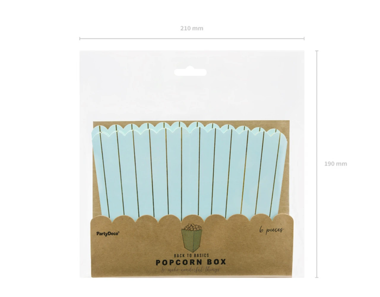 Doosjes voor popcorn, lichtblauw met gouden strepen, afmetingen na assemblage ca. 7 x 7 x 12,5 cm.