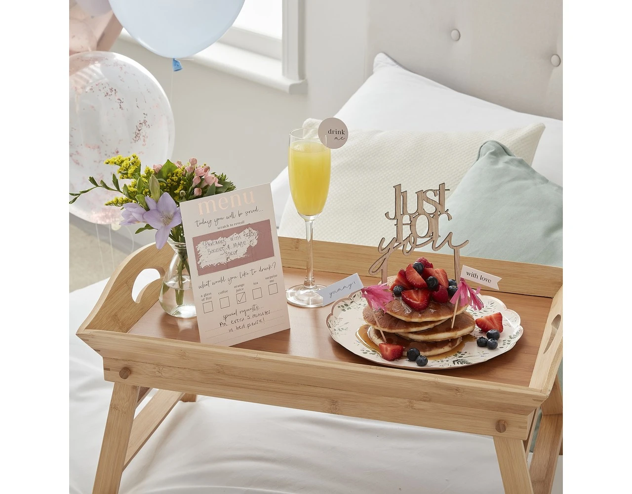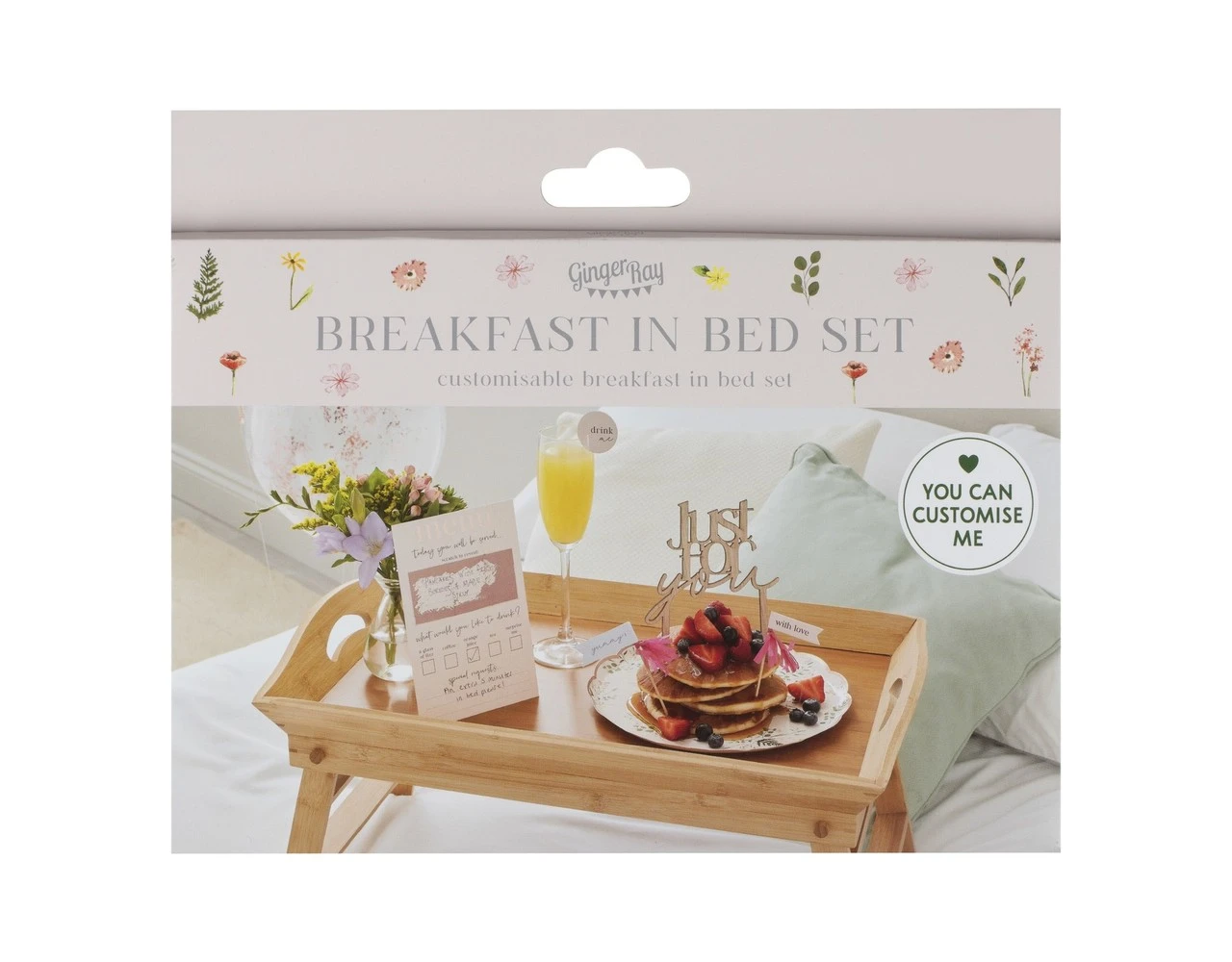Deze doordachte en aanpasbare kit bevat alles wat je nodig hebt om de hele dag een grote glimlach op hun gezicht te toveren. Personaliseer het cadeau met een kras om het menu te onthullen met al hun favoriete eten – de perfecte finishing touch! Deze ontbijt-op-bed-kit is perfect om te gebruiken voor Moederdag of voor een fantastische verjaardagstraktatie.
